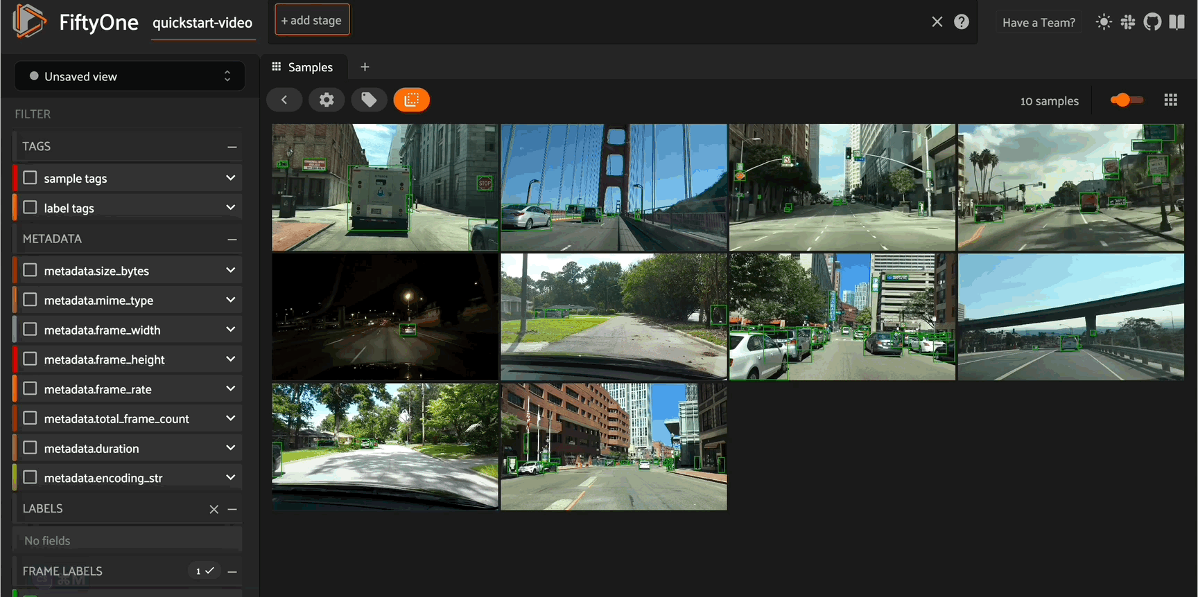 Again, there are many ways to do this. Perhaps the simplest is to use FiftyOne’s ToFrames ViewStage to generate a view containing one image per frame across all video samples. You can then construct a similarity index for this view using compute_similarity(), and query with the text prompt “cars in an intersection”: