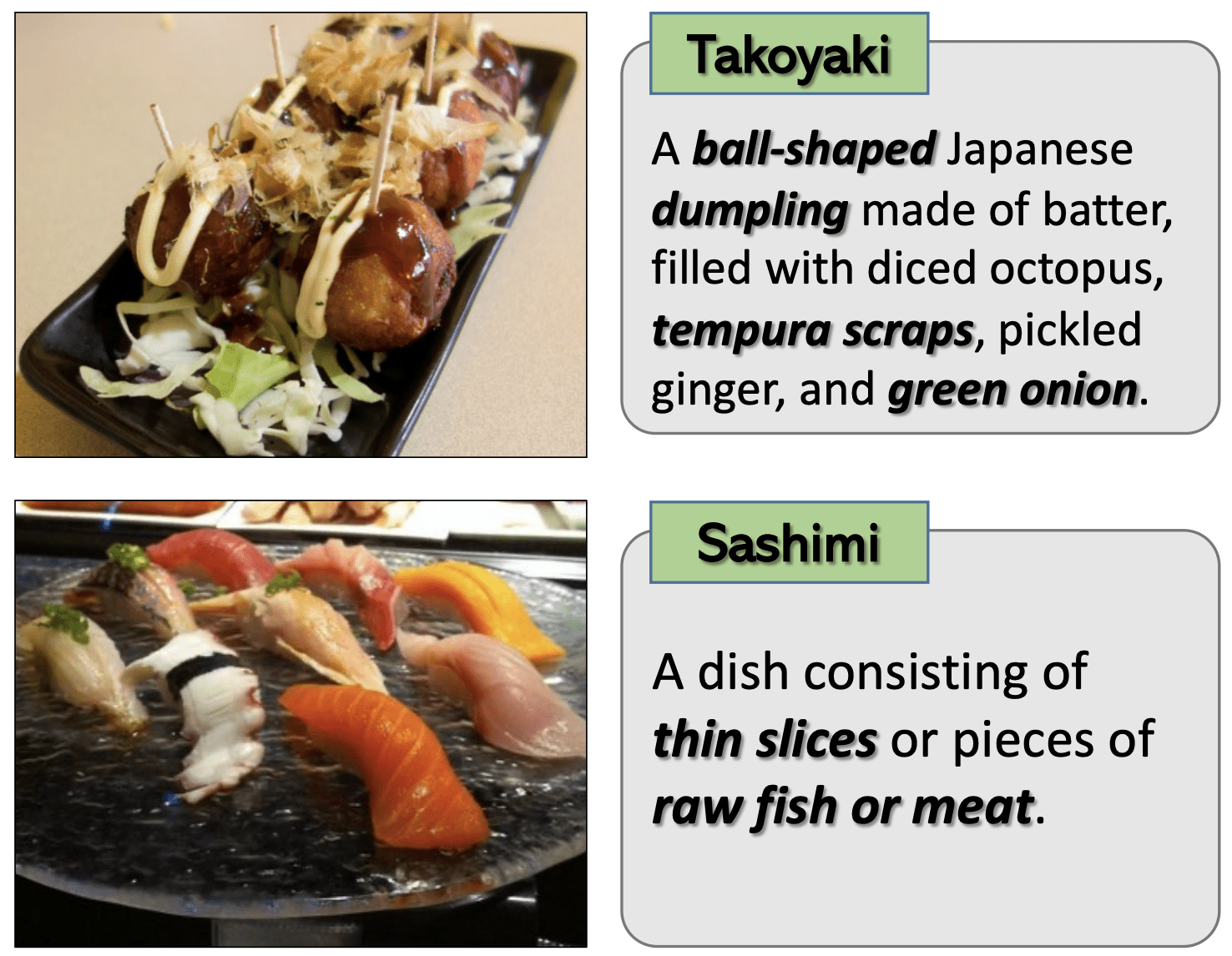 Motivating examples of external knowledge augmentation for vision-language understanding. As the authors argue, “when we visit a Japanese restaurant for the first time, we may struggle to understand the menu by only looking at the dish names (e.g., Takoyaki, Sashimi), as it is hard to imagine what they are. However, it becomes much clearer once a waiter introduces these concepts”. Image originally from K-LITE paper.