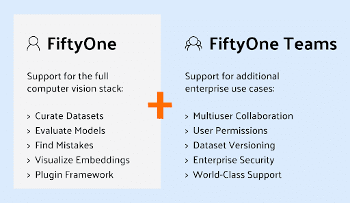 FiftyOne Teams extends FiftyOne with a GSuite-like experience for teams that want to collaborate on data stored in a centralized location with additional features like user permissions, dataset versioning, cloud-backed media, and enterprise security.
