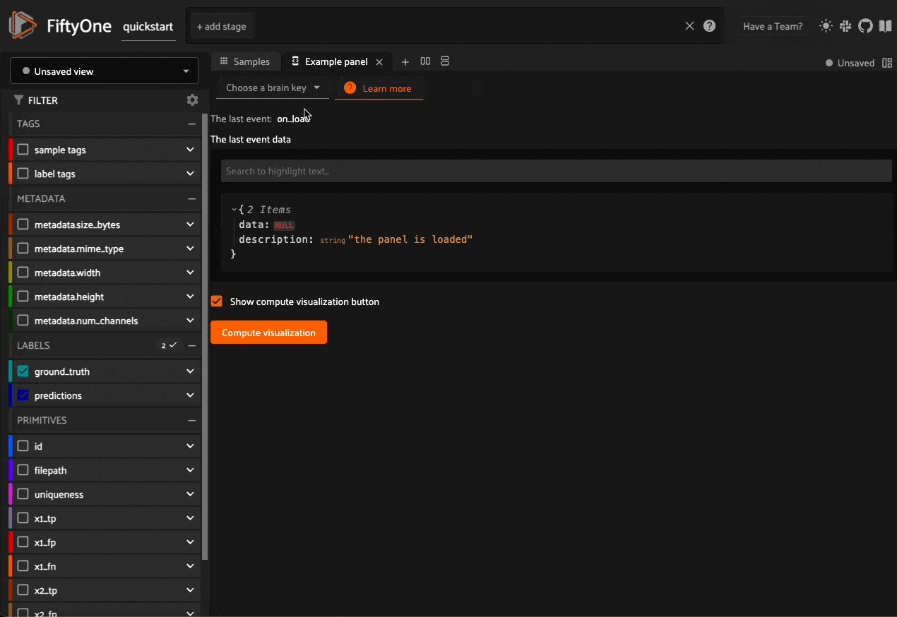 For example, here’s a panel that displays a histogram of a specified field of the current dataset where clicking a bar loads the corresponding samples in the App: