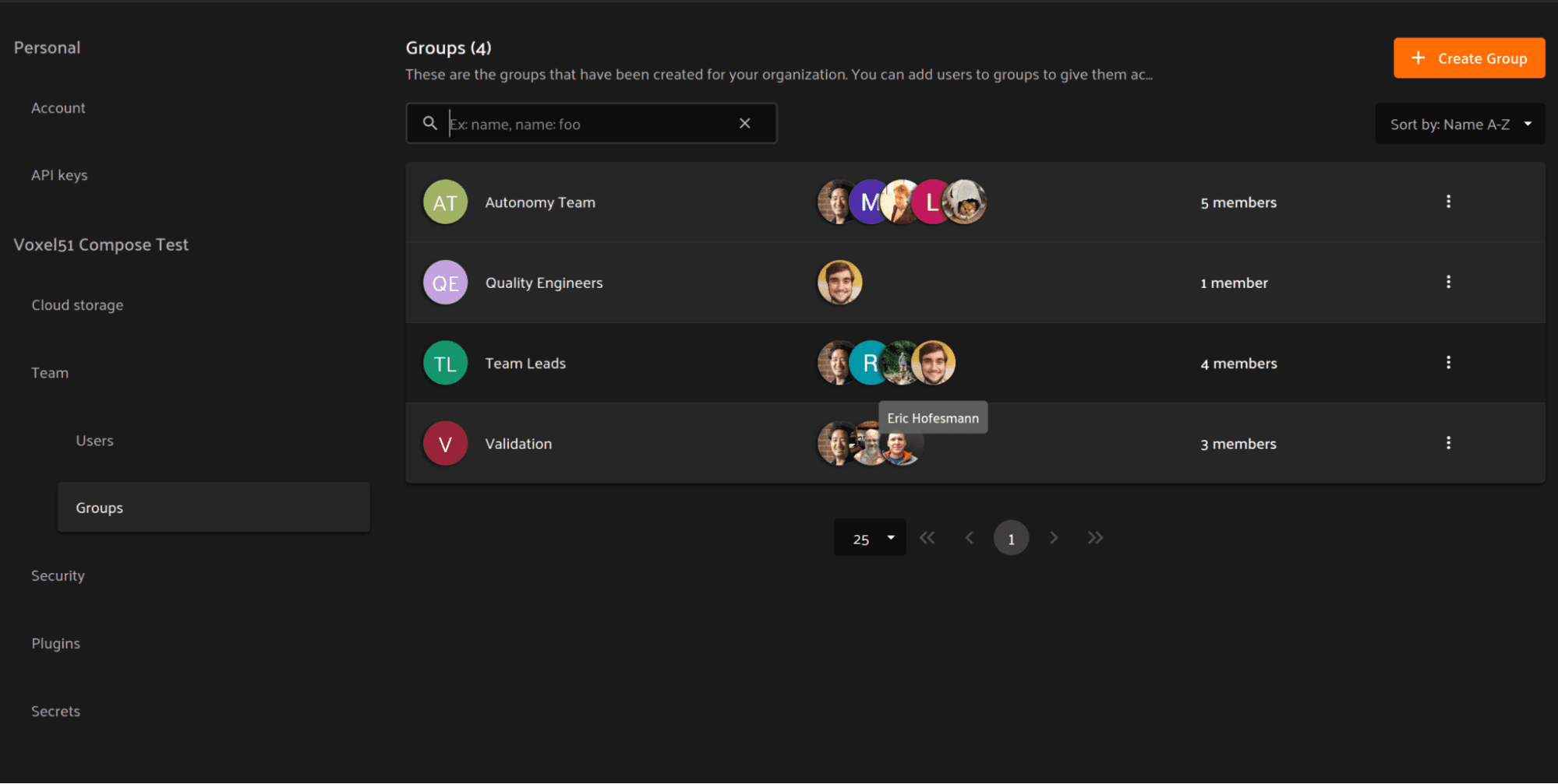 On sign-in to the FiftyOne Teams App, the Azure AD group access for the user Eric Hofesmann is synced, automatically adding them to the Team Leads group, creating the new group Quality Engineers, and also assigning them to the Quality Engineers group. Comparing this to the screenshot in the previous section allows you to see the changes that have been applied.