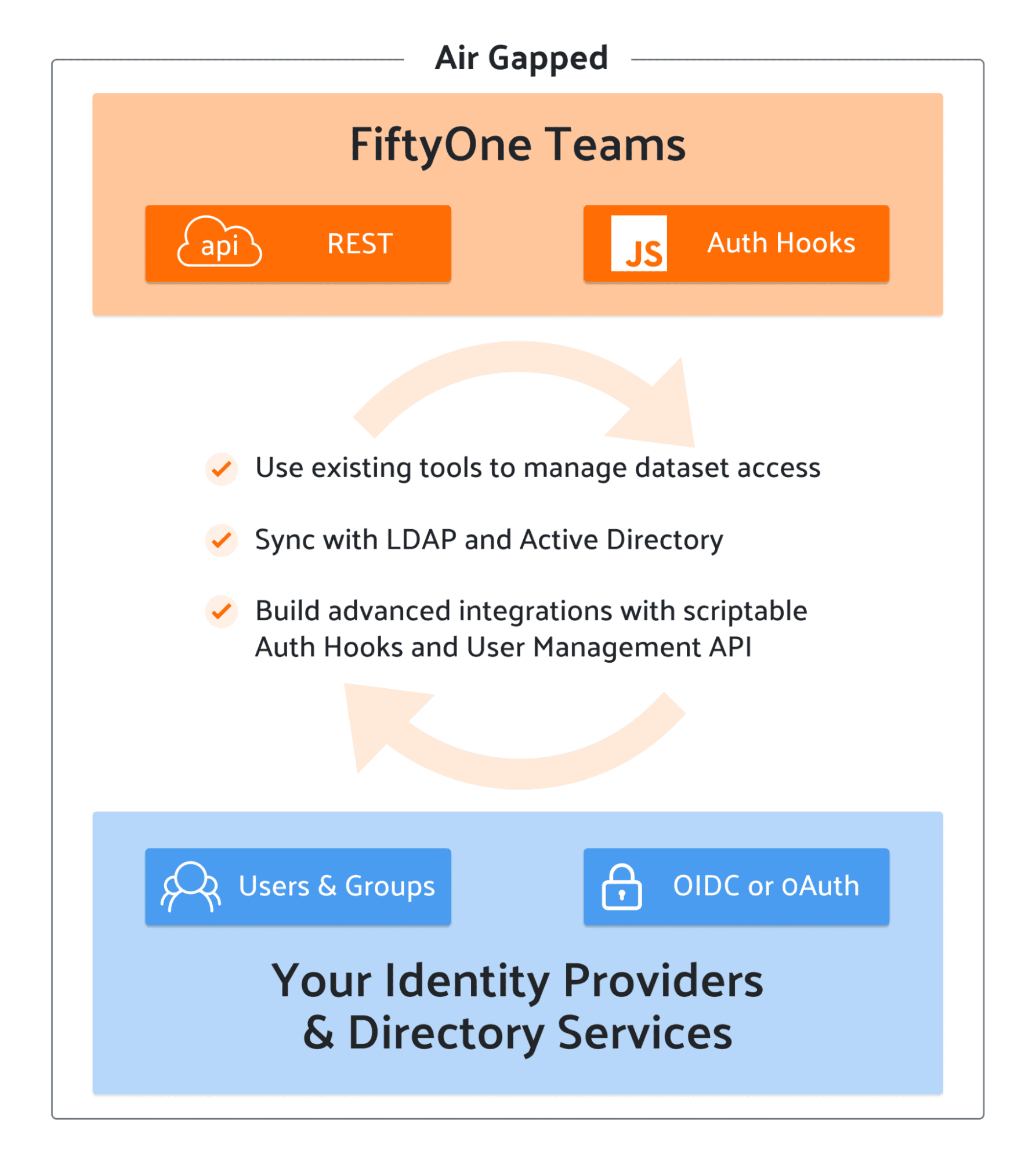 By popular demand, FiftyOne Teams v1.6 can now be deployed in fully air-gapped environments! Previous versions of FiftyOne Teams relied on an outbound connection to Auth0 for authentication and authorization. With v1.6, this dependency is optional. You can now develop your datasets and models on a fully air-gapped installation of FiftyOne Teams that is compatible with a variety of OIDC- and OAuth2-based authentication and authorization systems. Learn more in the docs.