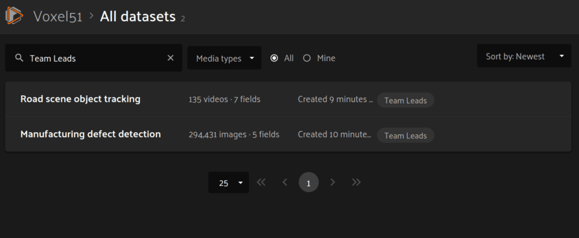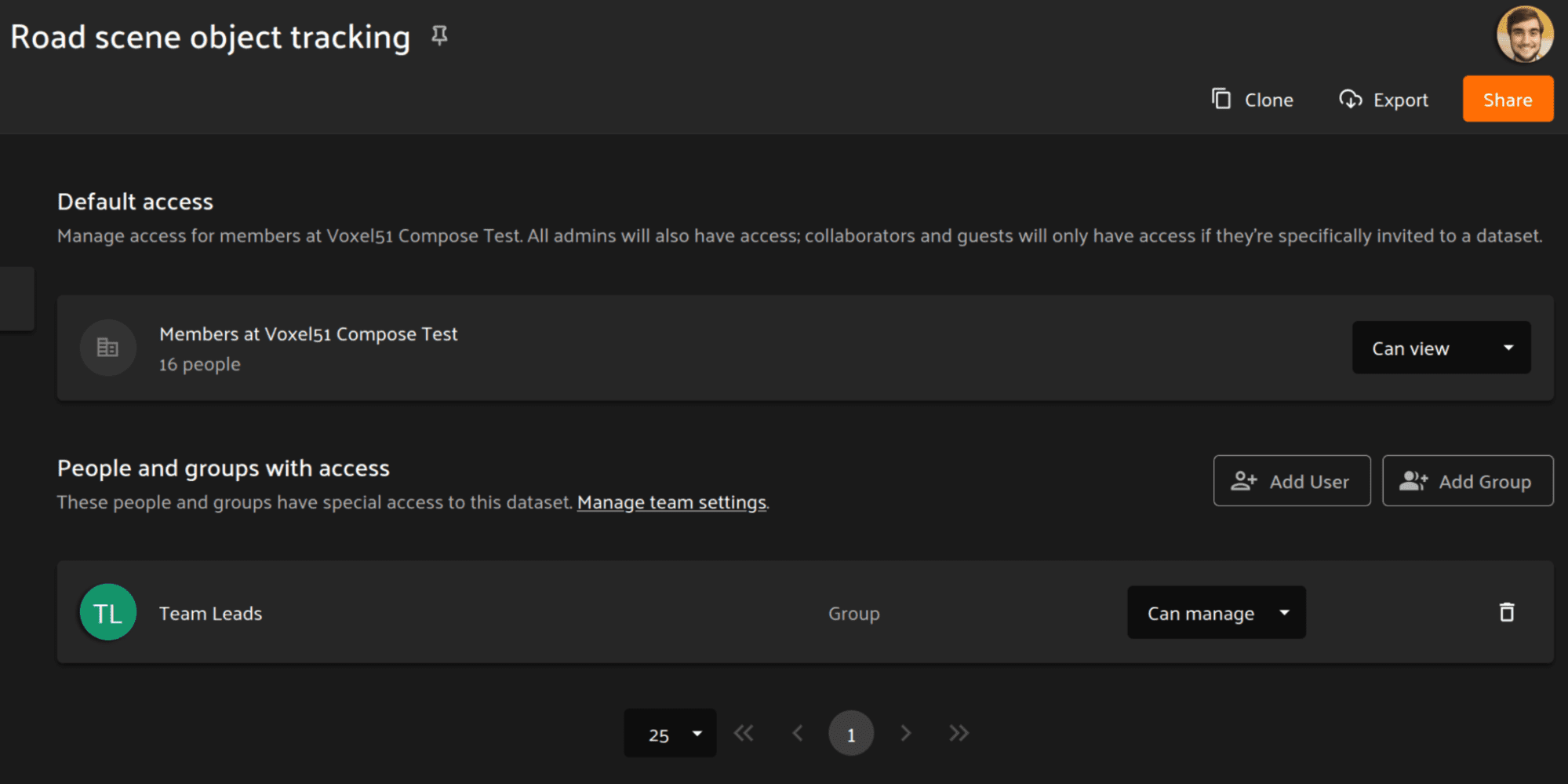 Since the Team Leads group has been granted permission to access the datasets Road scene object tracking and Manufacturing defect detection, the user is automatically granted permission to those datasets and can immediately begin working with them.