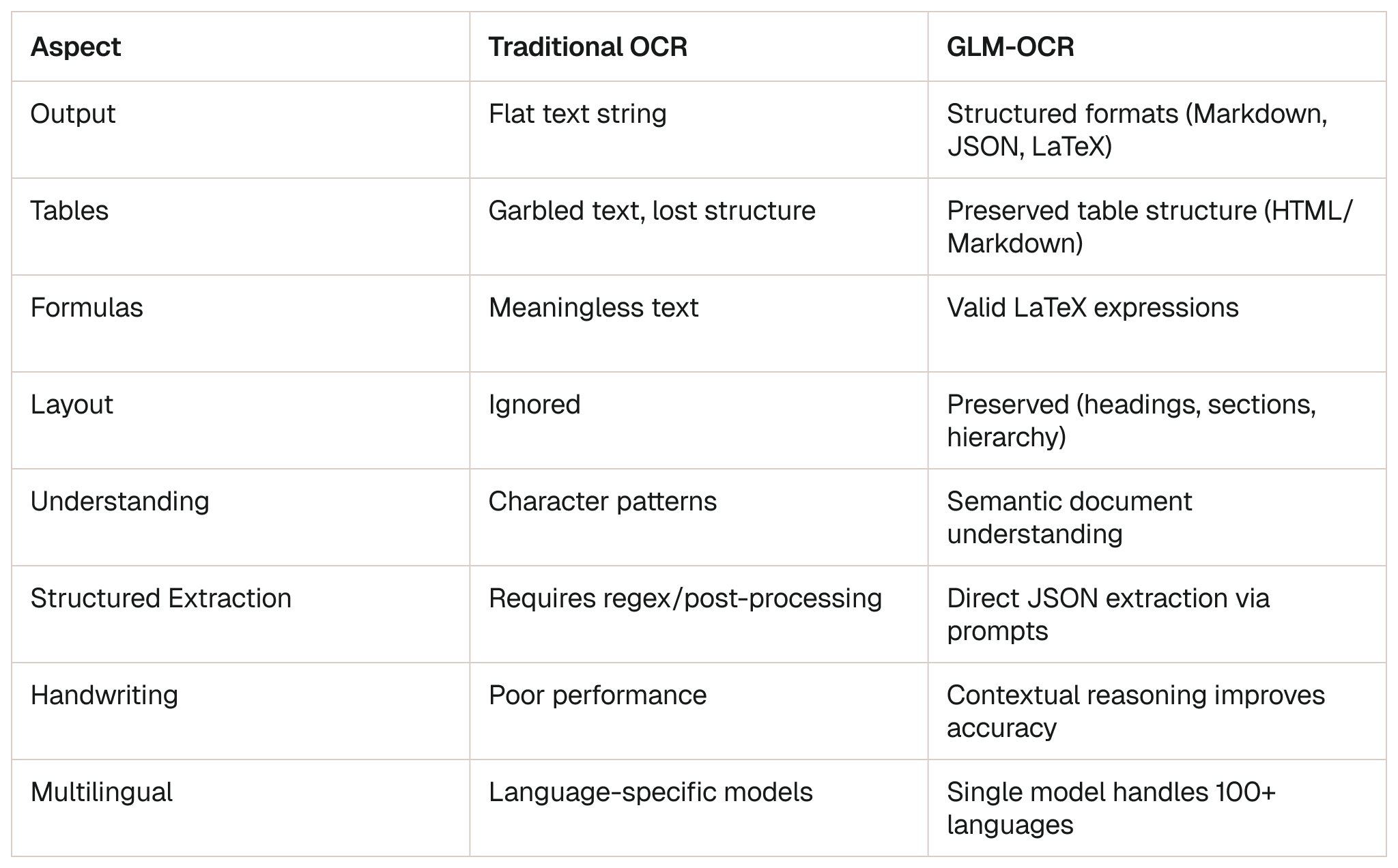 Fundamentally different: GLM-OCR understands document semantics, not just characters.