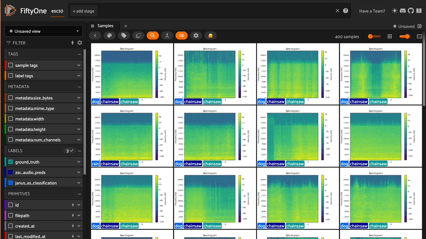 This visual inspection often reveals insights that might not be immediately apparent from the raw data or statistics alone. Exploring the spectrograms data in the FiftyOne app We’ll also need the labels later on, we can grab them like so: