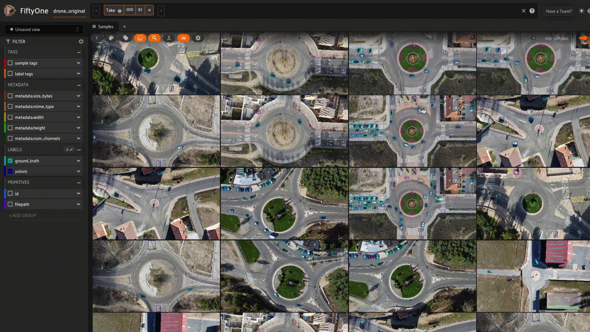 We can grab awesome insights of where maybe we need to add to our dataset. We can potentially try to add more parked car views, different street views other than roundabouts, or even think about decreasing the height of the drone to increase the information we get about each car. Looking through our highest and lowest confidence predictions compared to ground truths allows us to learn more about data than a simple training run or evaluation could ever do. If you'd like learn more, check out this talk I gave about many of the topics in this blog in August at the Computer Vision Meetup. In summary, this tutorial has explored the exciting realm of harnessing the potential of drone data, spotlighting the synergy between FiftyOne and Ultralytics YOLOv5. By meticulously curating drone data and leveraging these powerful tools, this guide equips both AI enthusiasts and machine learning practitioners with the expertise to navigate the complexities of object detection training. The provided steps, from data preparation and model training to post-training analysis, underscore the importance of tailored approaches for specific use cases of working with drone data. By offering insights into model performance and utilizing embeddings for deeper analysis, this tutorial empowers users to drive accuracy and make informed decisions in the dynamic intersection of drone technology and artificial intelligence.