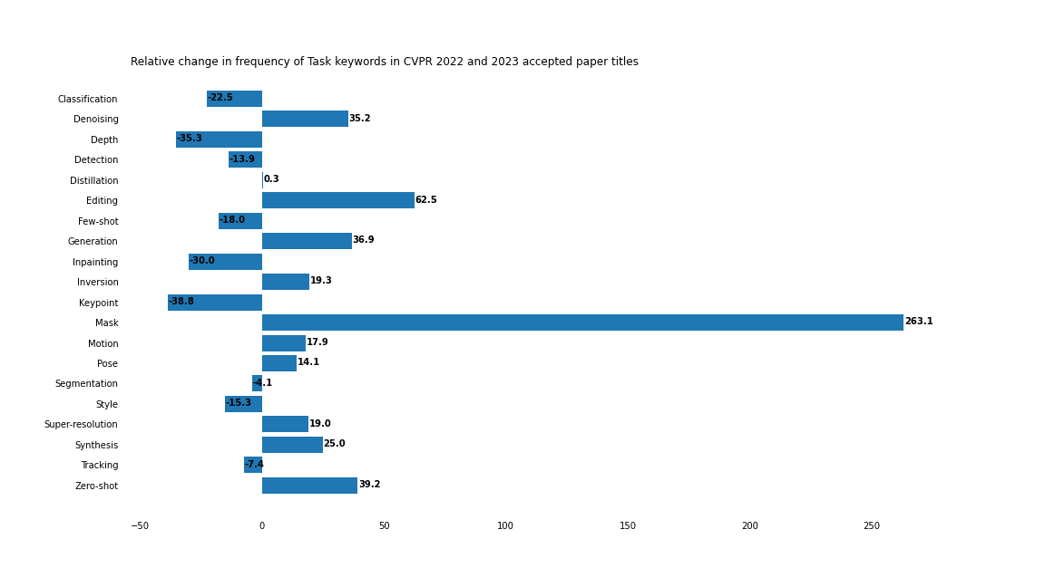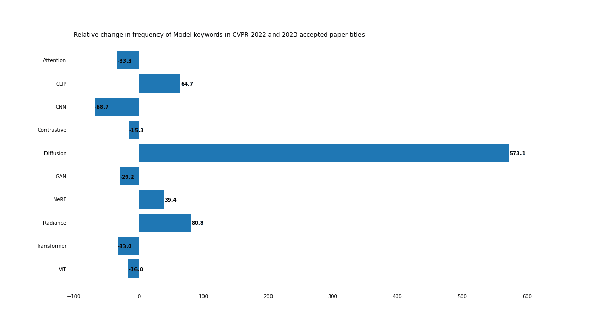 In addition to the 2023 paper titles, we scraped the titles for all 2022 accepted CVPR papers. From these two lists, we calculated the relative frequency of various keywords, giving high-level insight into what is trending up and what is trending down. Here are the highlights, presented in terms of percent change relative to 2022 frequencies.