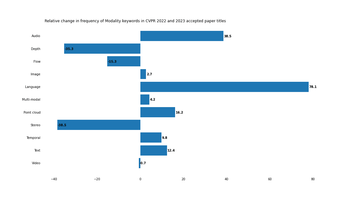 While the frequency of traditional computer vision keywords like “image” and “video” is relatively unchanged, “text”/”language” and “audio” are appearing more often. Even if the word “multi-modal” itself is not cropping up in paper titles, it is hard to deny that computer vision is trending towards a multi-modal future.