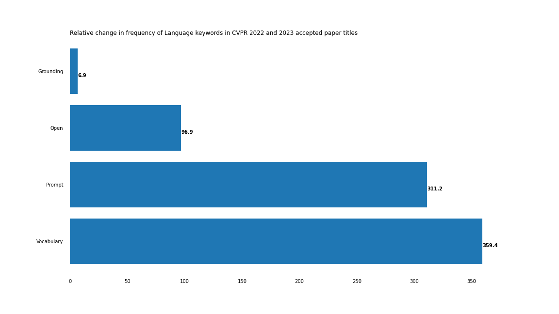 This is especially pronounced for vision-language tasks, as evidenced by the sharp upticks for “Open”, “Prompt,” and “Vocabulary”. The most extreme example of this is the compound term “Open-vocabulary”, which occurred just 3 times in 2022, but shows up 18 times in 2023.