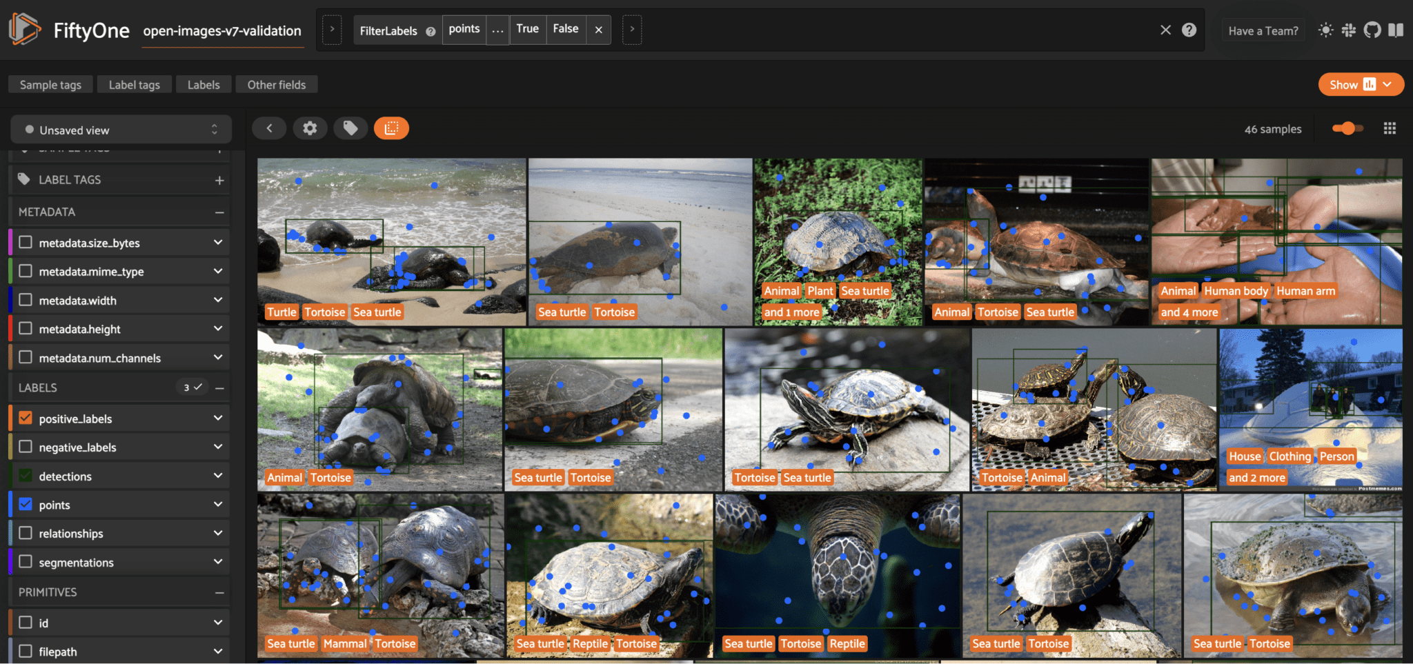 One thing we might want to do is extract a subset of the dataset with point labels for particular classes. As an example, suppose we are working on a wildlife conservation project and we want to train a model to identify turtles and tortoises. In FiftyOne there are multiple ways to accomplish this!