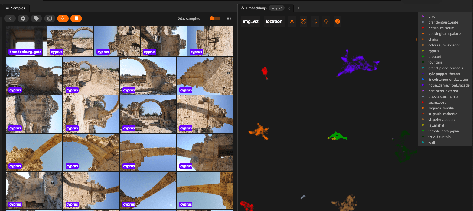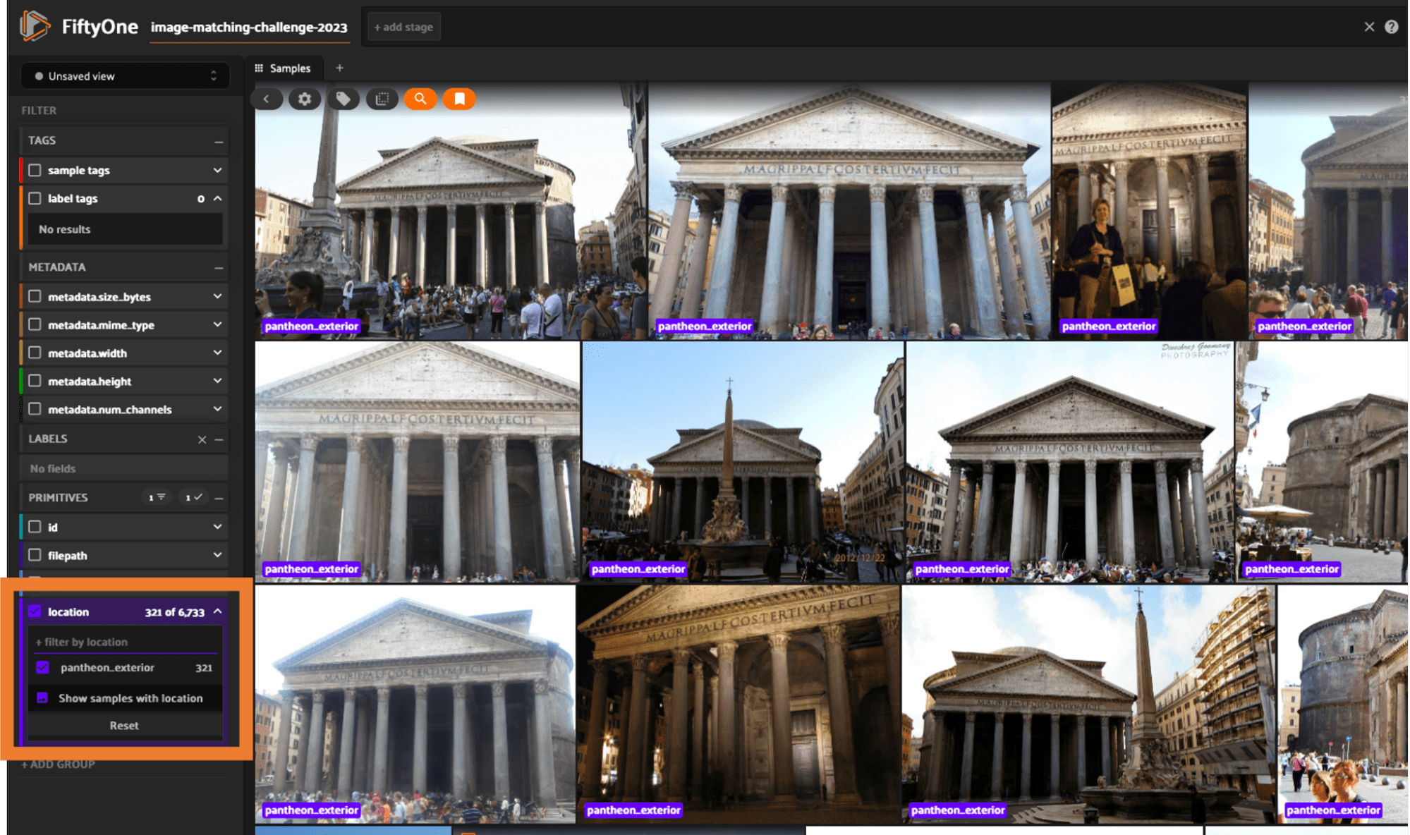 The dataset includes 23 distinct locations including Notre Dame, Taj Mahal, Buckingham Palace, the Lincoln Memorial and more. For example, let’s filter the samples by those labeled pantheon_exterior.