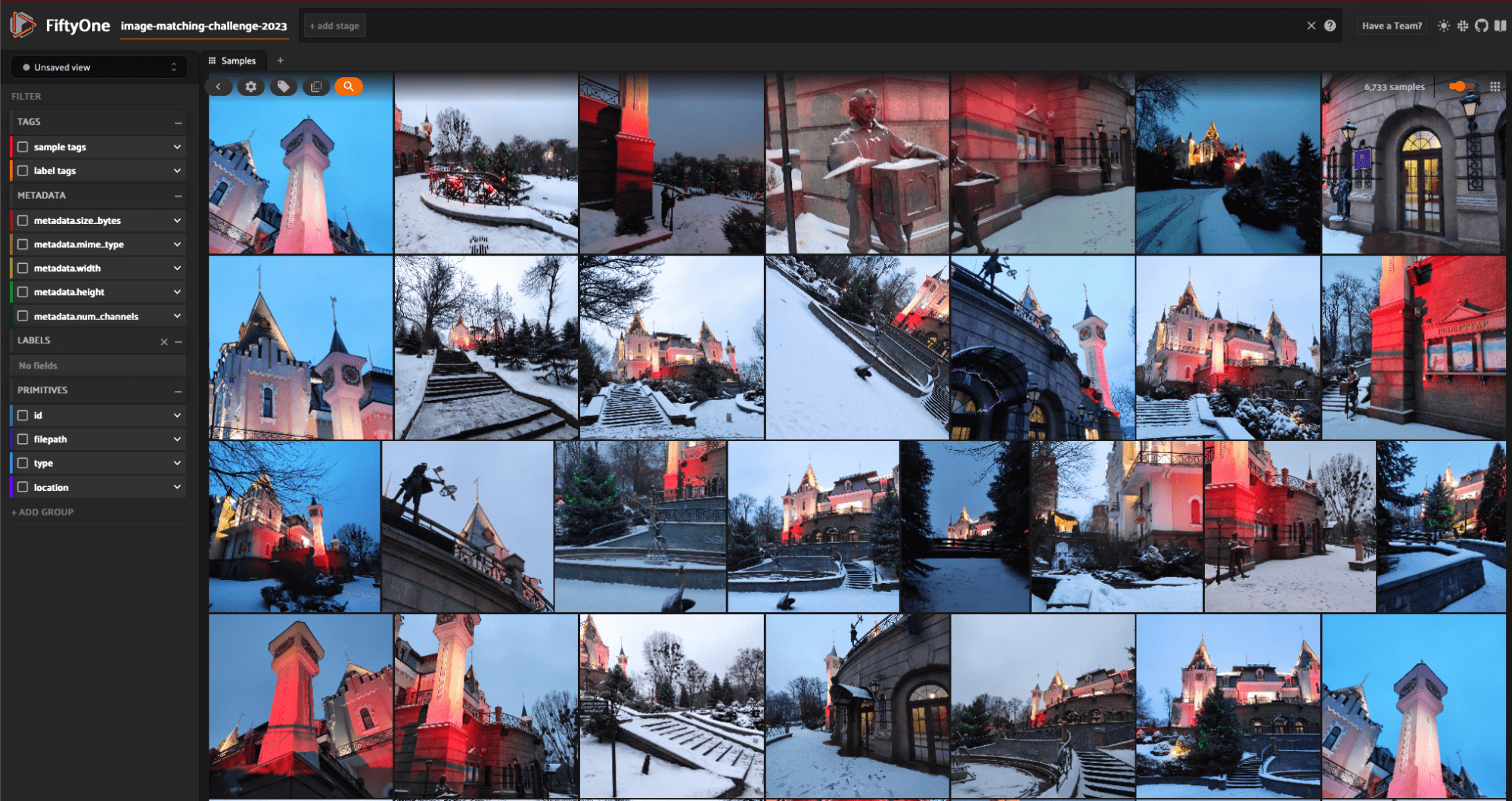 The code snippet above will launch the FiftyOne App in your default browser. You should see the following initial view of the image-matching-challenge-2023 dataset by default in the App: