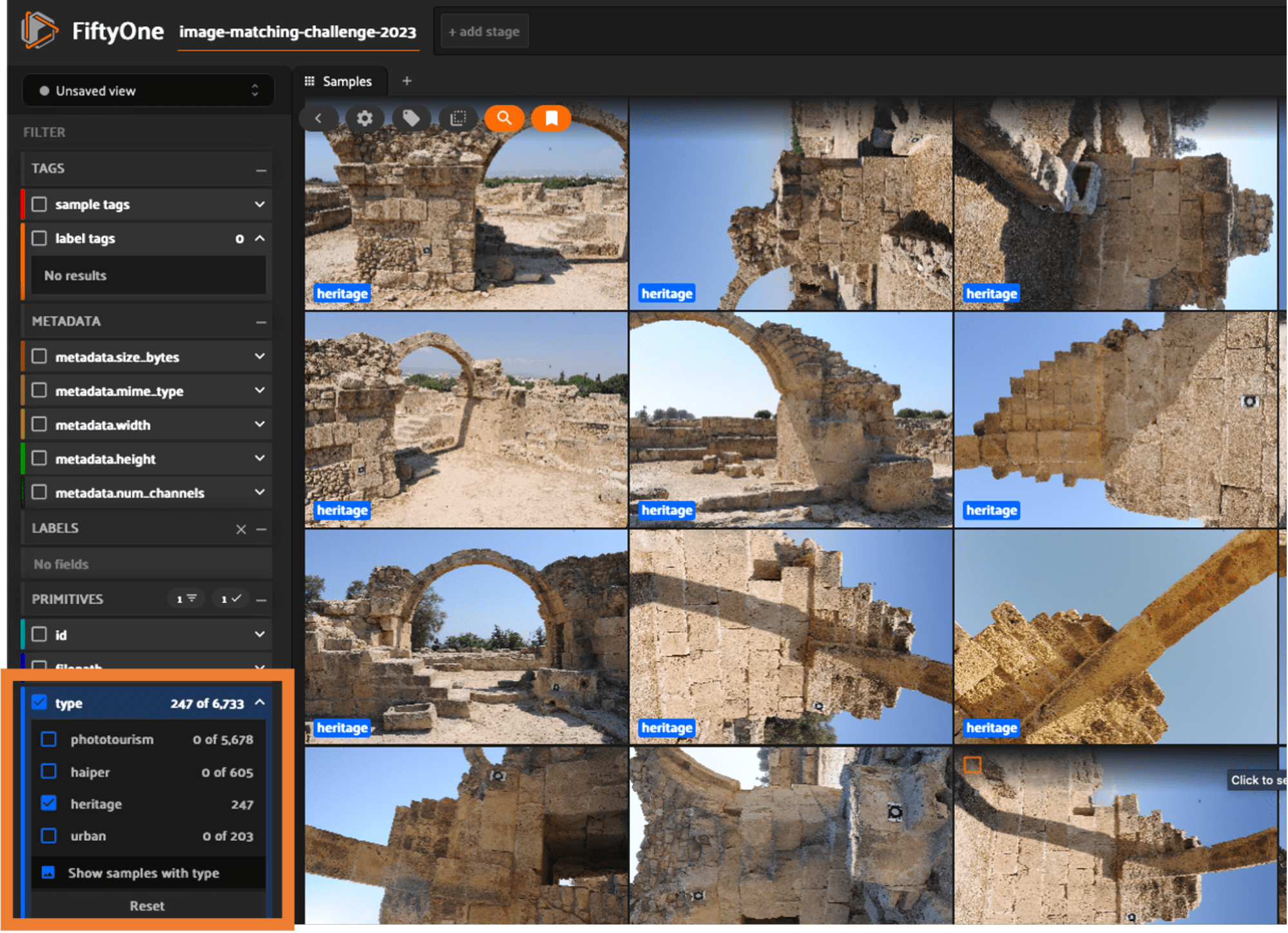 The dataset includes four ‘types’, including phototourism, haiper, heritage, and urban. For example, let’s filter the samples by those of the heritage type.