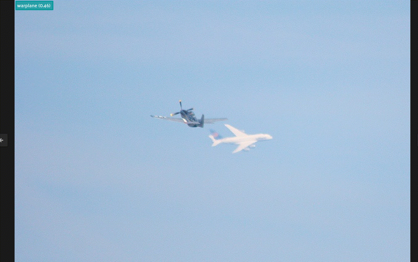Again, we can see that the model is making an accurate prediction above with a warplane. However, the model according to the heatmaps is barely looking at the planes! How could this be possible? The model is most likely looking at the objects in the center and realizing the rest of the image is just sky. The sky then heavily impacts its decision towards making the classification of warplanes. While this is still generating correct predictions, this line of thinking for the model could spell trouble down the line.