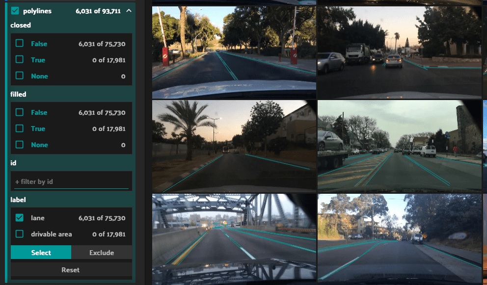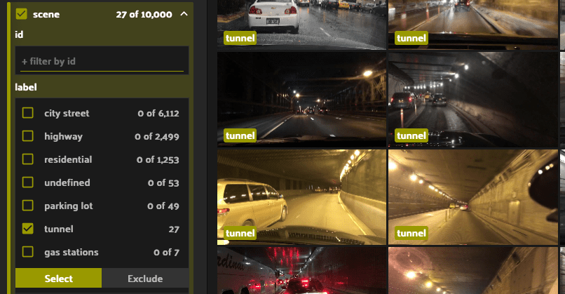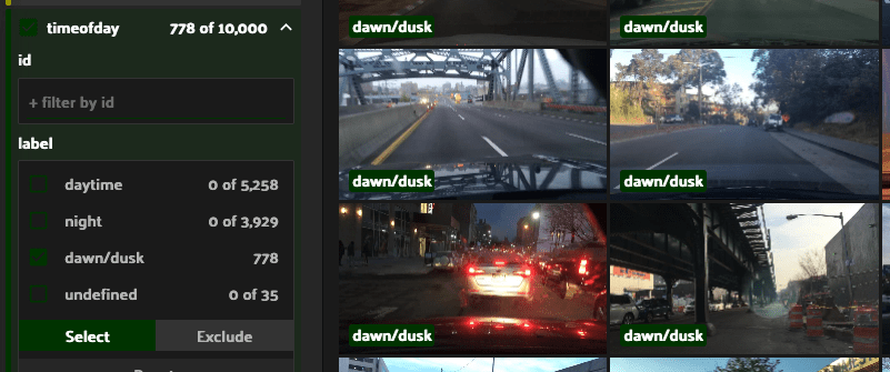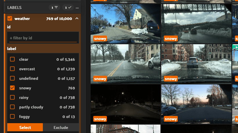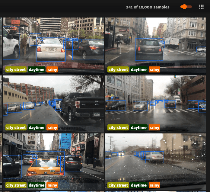 Let’s say we want to limit our view to just samples where cars are present on city streets during the daytime while it is raining. Simply make the selections in the sidebar filter to view the 241 samples that meet this criteria.