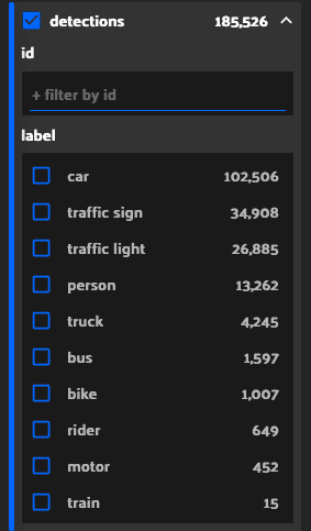 We can limit the detections view to specific labels by selecting detections > label > truck for example: