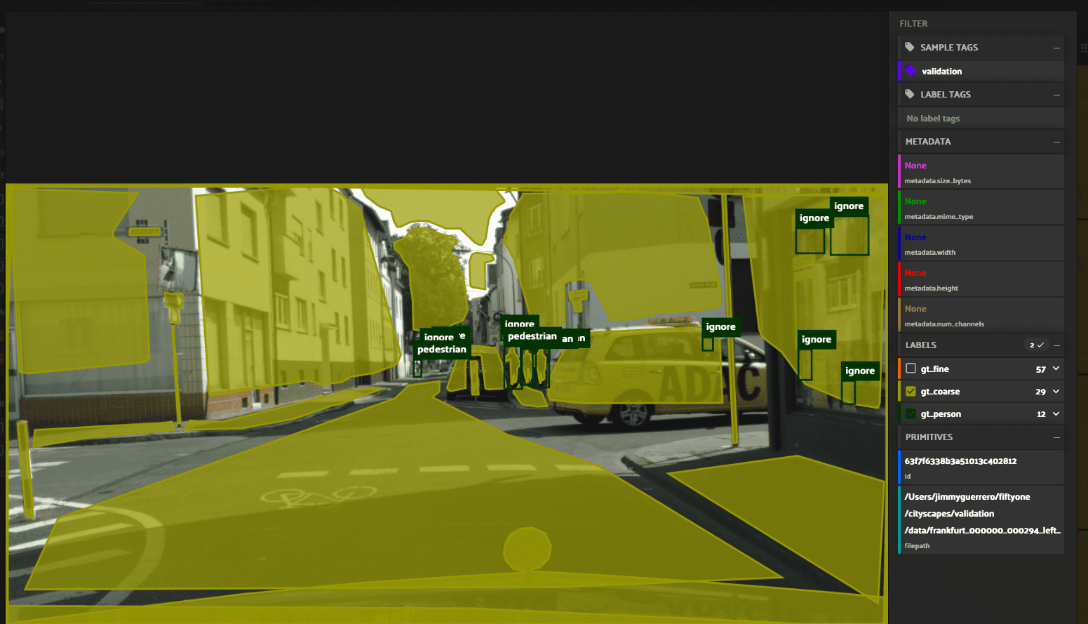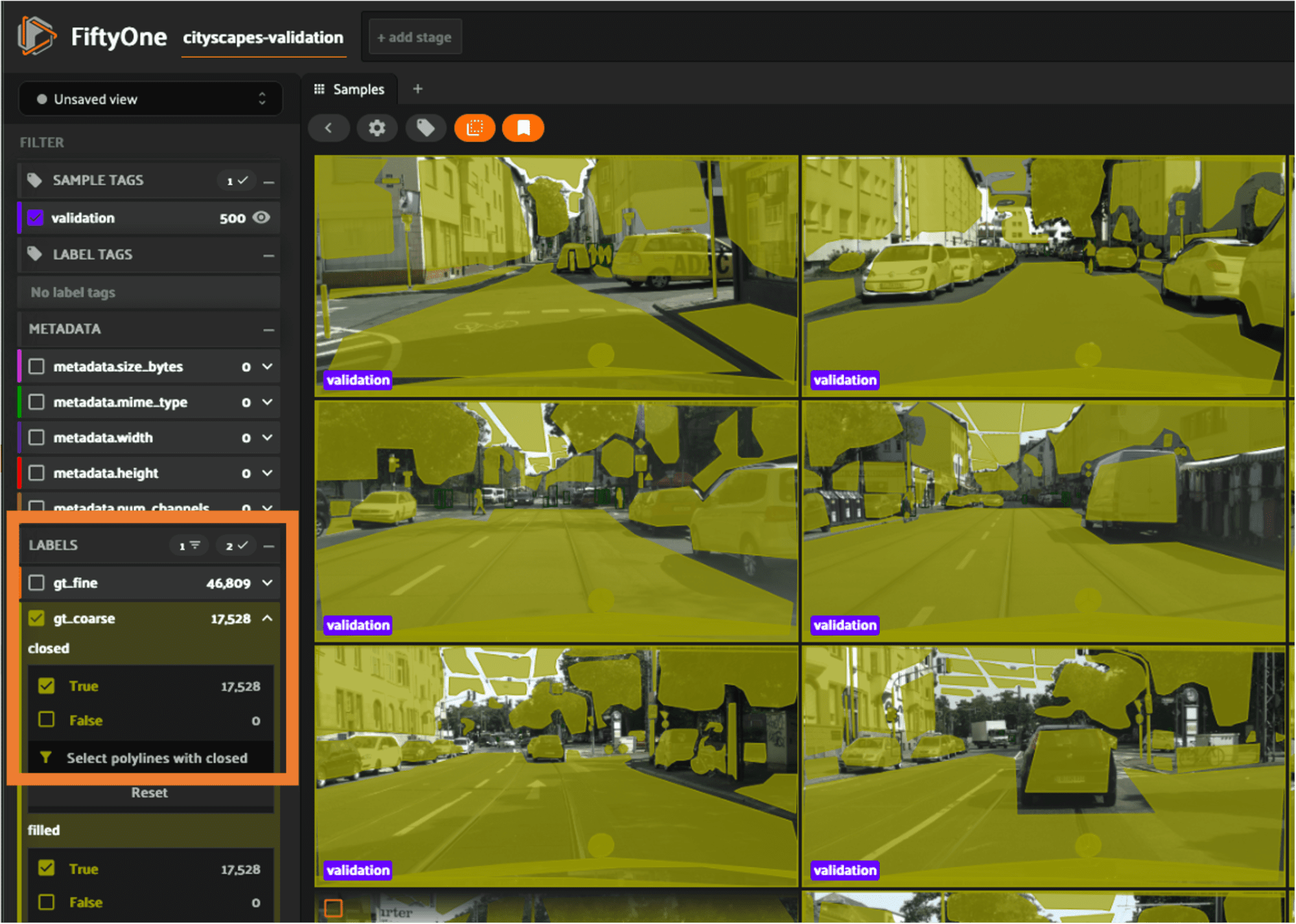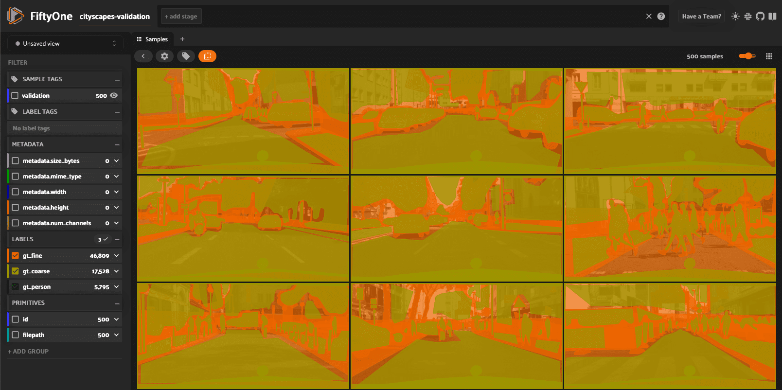 The last line in the code snippet will launch the FiftyOne App in your default browser. You should see the following initial view of the cityscapes-validation dataset in the FiftyOne App: