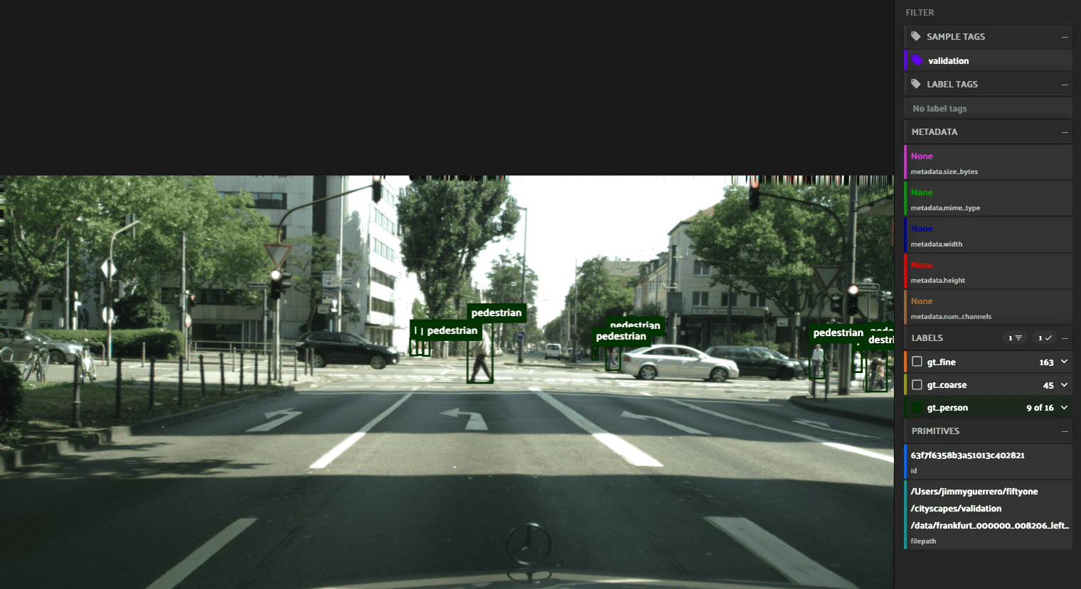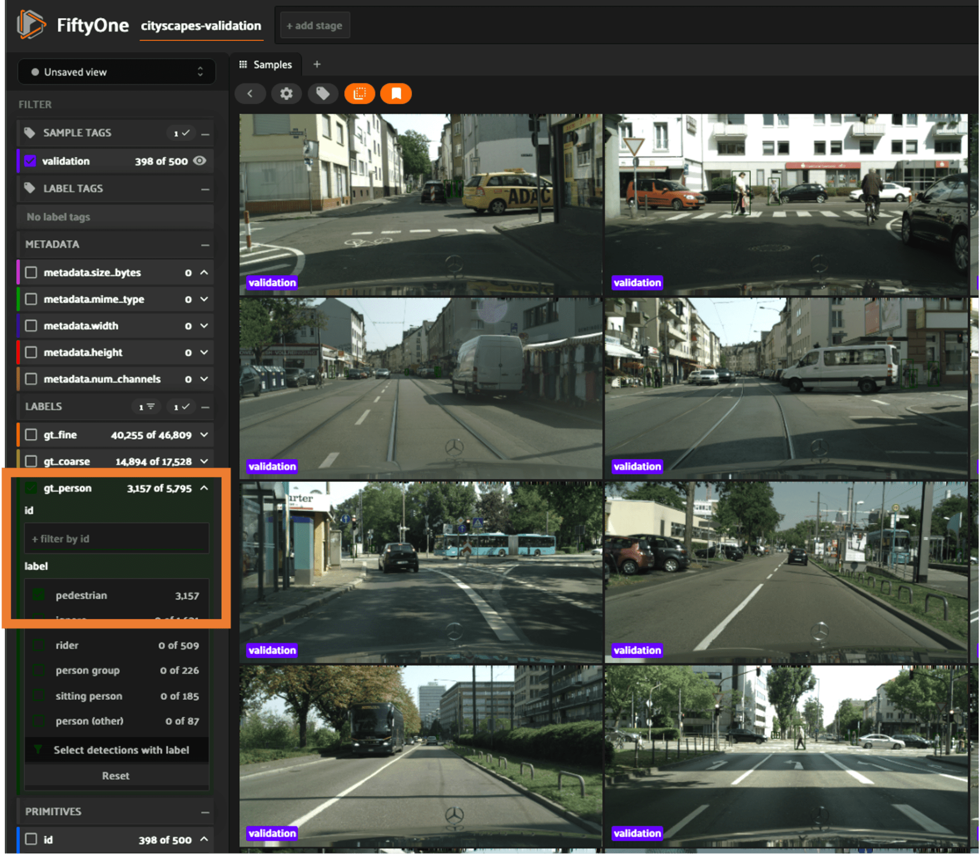 In this example we filter the samples by the gt_person label selecting only those with pedestrian: