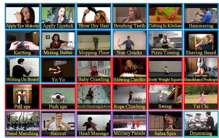 The videos in the 101 action categories are grouped into 25 groups, where each group can consist of 4-7 videos of an action. Videos from the same group can share some common features, such as a similar background, viewpoint, etc.