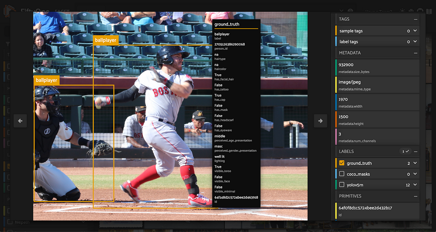 This leverages FiftyOne’s built-in evaluate_detections() method to compute the IoU of each prediction bounding box that has overlap with a ground_truth bounding box. We pass in classwise=False because the labels for the ground truth detections are the 52 classes in the FACET dataset, whereas the label for our predictions is `person`. Which set of predictions to evaluate is specified by label_field.