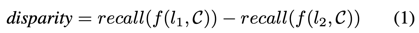 Disparity equation from FACET paper. l1 and l2 represent attributes, and C represents a common concept.