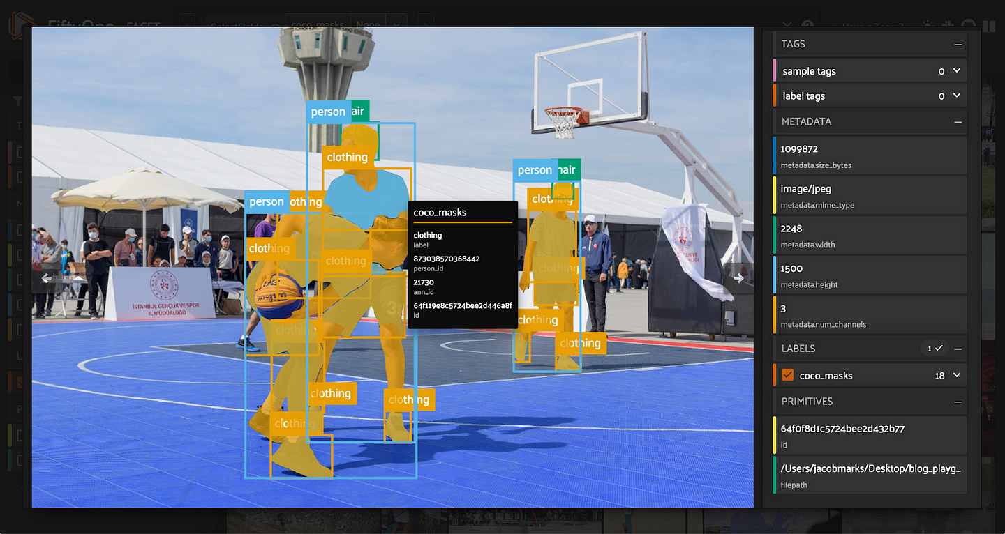 While the person, hair, and clothing segmentation masks are not strictly necessary for the detection and classification evaluation routines in the next section, it’s worth demonstrating how to add them, as the person masks can be used to evaluate instance segmentation models!