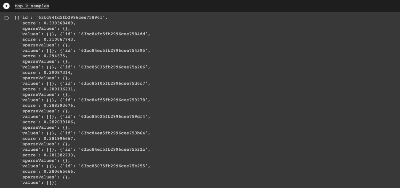 Note: the top_k argument for Pinecone queries is capped at 10000. We'll also give an optional score_field argument where if score_field!= None, we will store the score values returned by the index query on the samples.