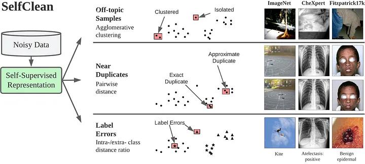 SELFCLEAN identifies off-topic samples, near duplicates, and label errors using dataset-specific representations and distance-based indicators. The authors demonstrate that SELFCLEAN outperforms competing methods for synthetic data quality issues and aligns well with metadata and expert verification in natural settings. Applying SELFCLEAN to well-known image benchmark datasets, the authors estimated the prevalence of various data quality issues and highlighted their impact on model scores.