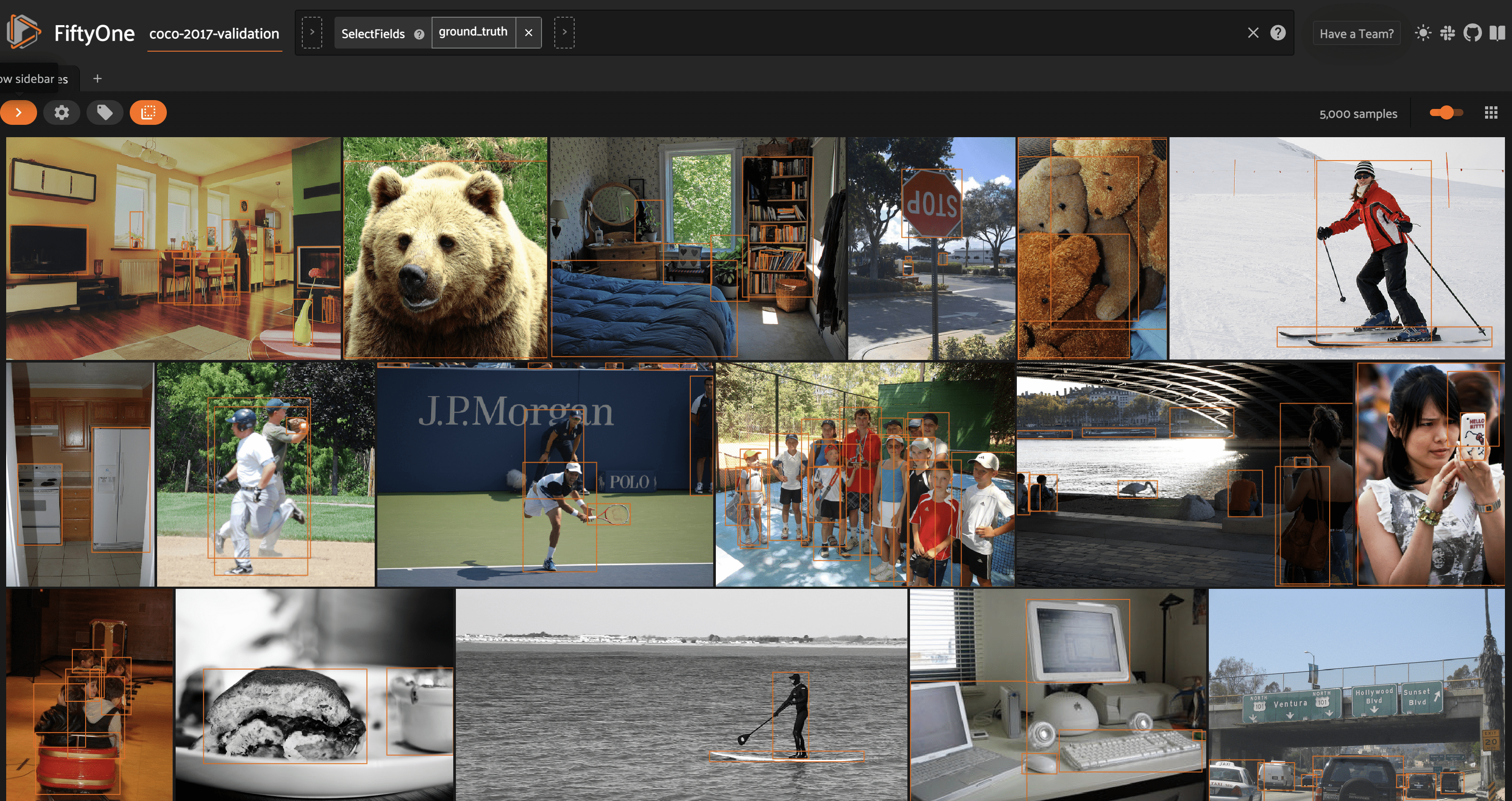 Let’s load the images and ground truth object detections in COCO’s validation set from the FiftyOne Dataset Zoo.