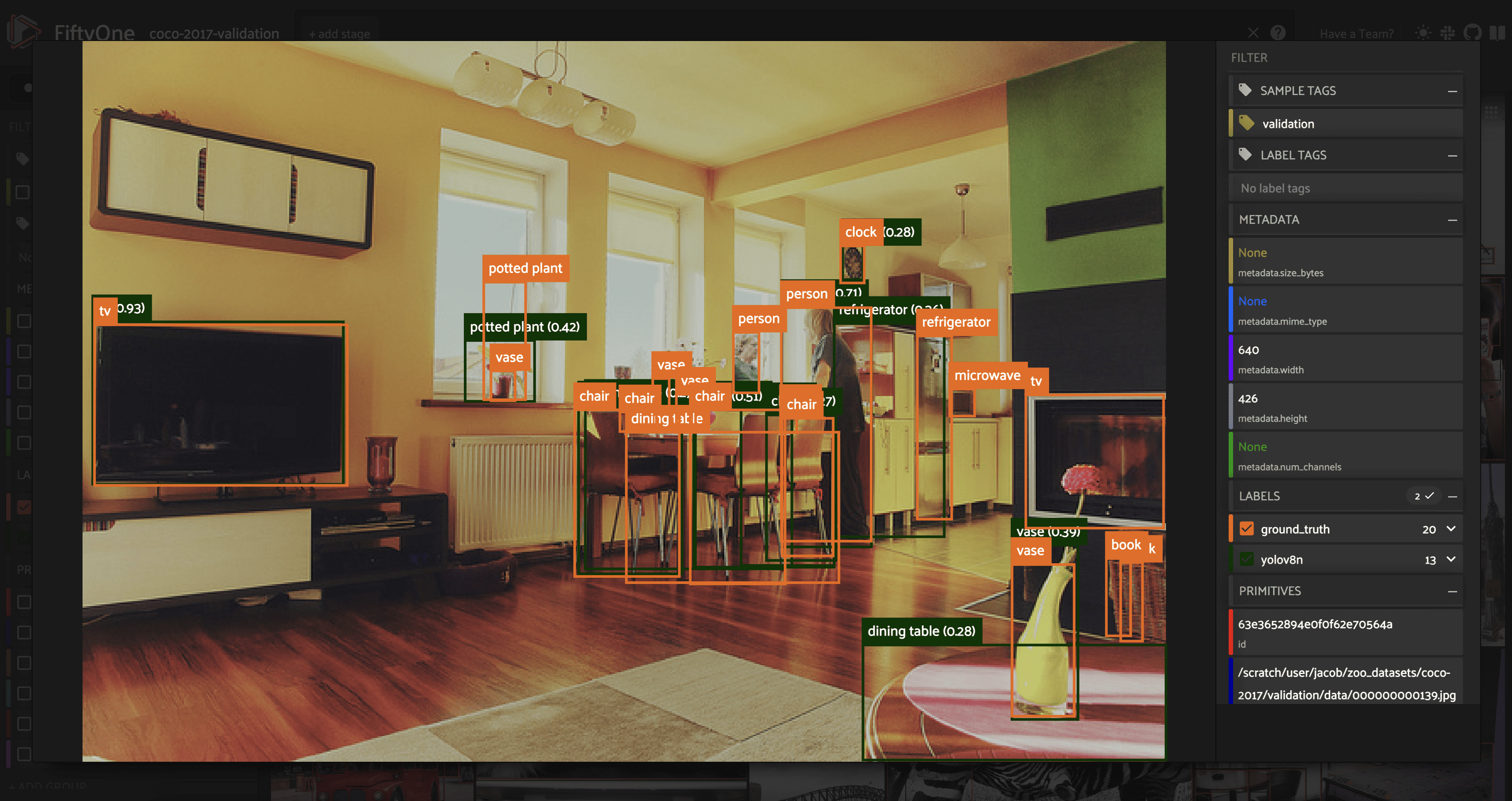 Note that if you run multiple inference calls for the same task, the predictions results are stored in a directory with the next available integer appended to predict in the file path. You can account for this in the above function by passing in the run_number argument. Putting the pieces together, we can write a function that adds these YOLOv8 detections to all of the samples in our dataset efficiently by batching the read and write operations to the underlying MongoDB database.