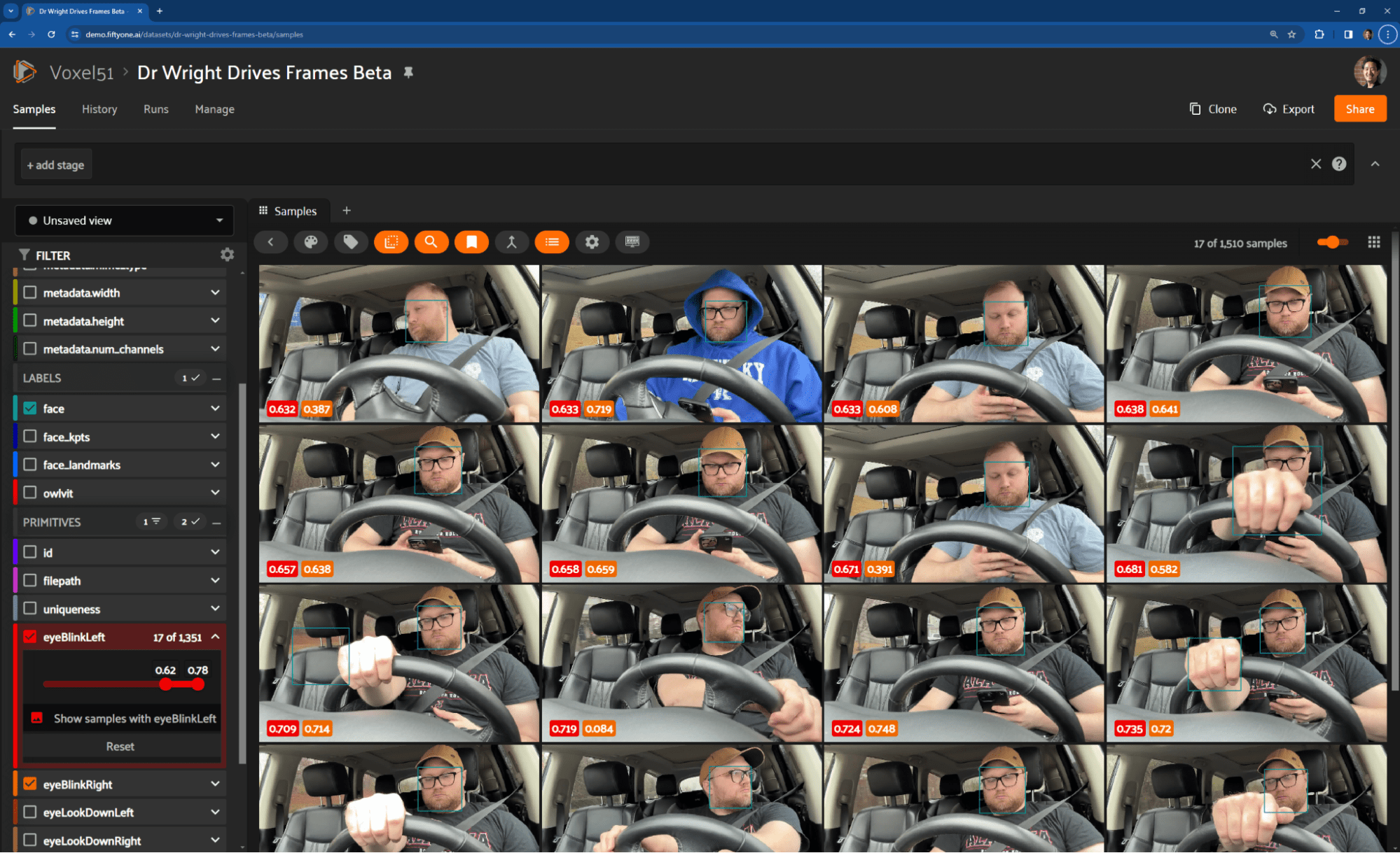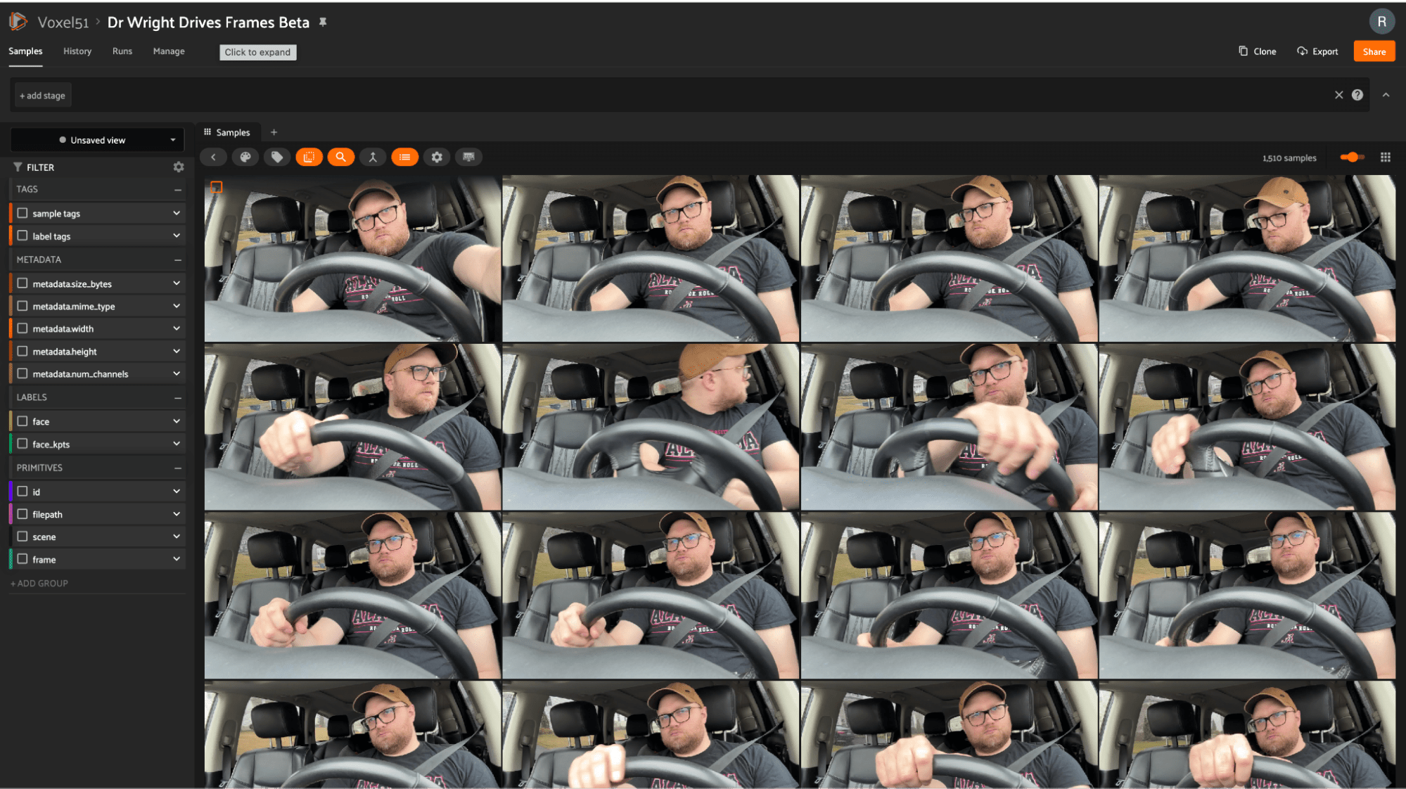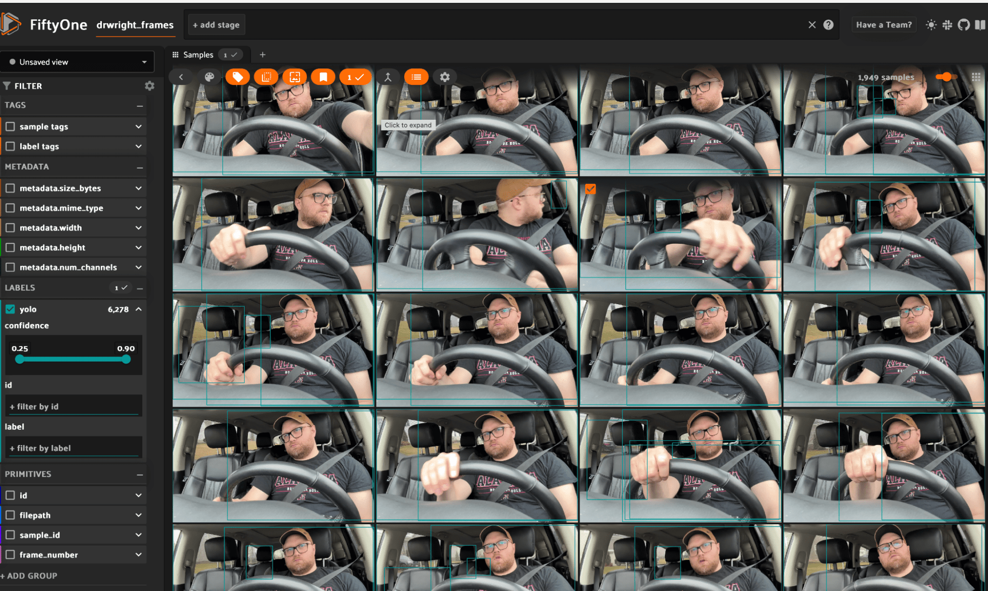 If you're interested, you can view my dataset instantly in your browser at https://try.fiftyone.ai/datasets/dr-wright-drives-frames/samples. It's the in-cabin perception dataset I discussed in this blog post made available in a read-only version of FiftyOne Teams. Try filtering the data using the left sidebar. Or click '+' next to ‘Samples’, select 'Embeddings', and choose a key. Now, lasso-select points of interest. What trends do you see?