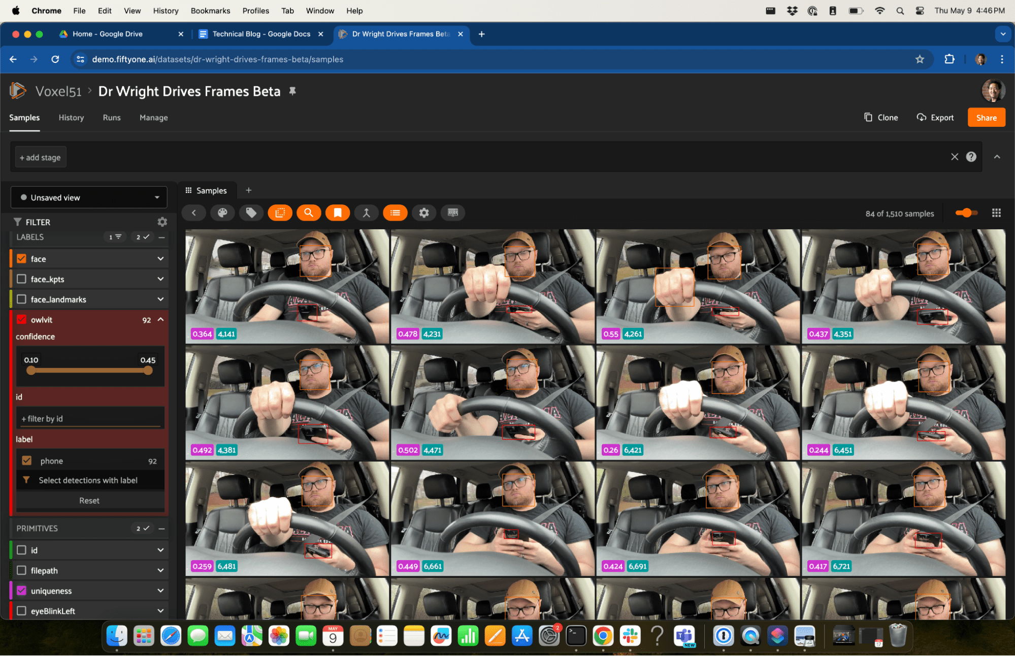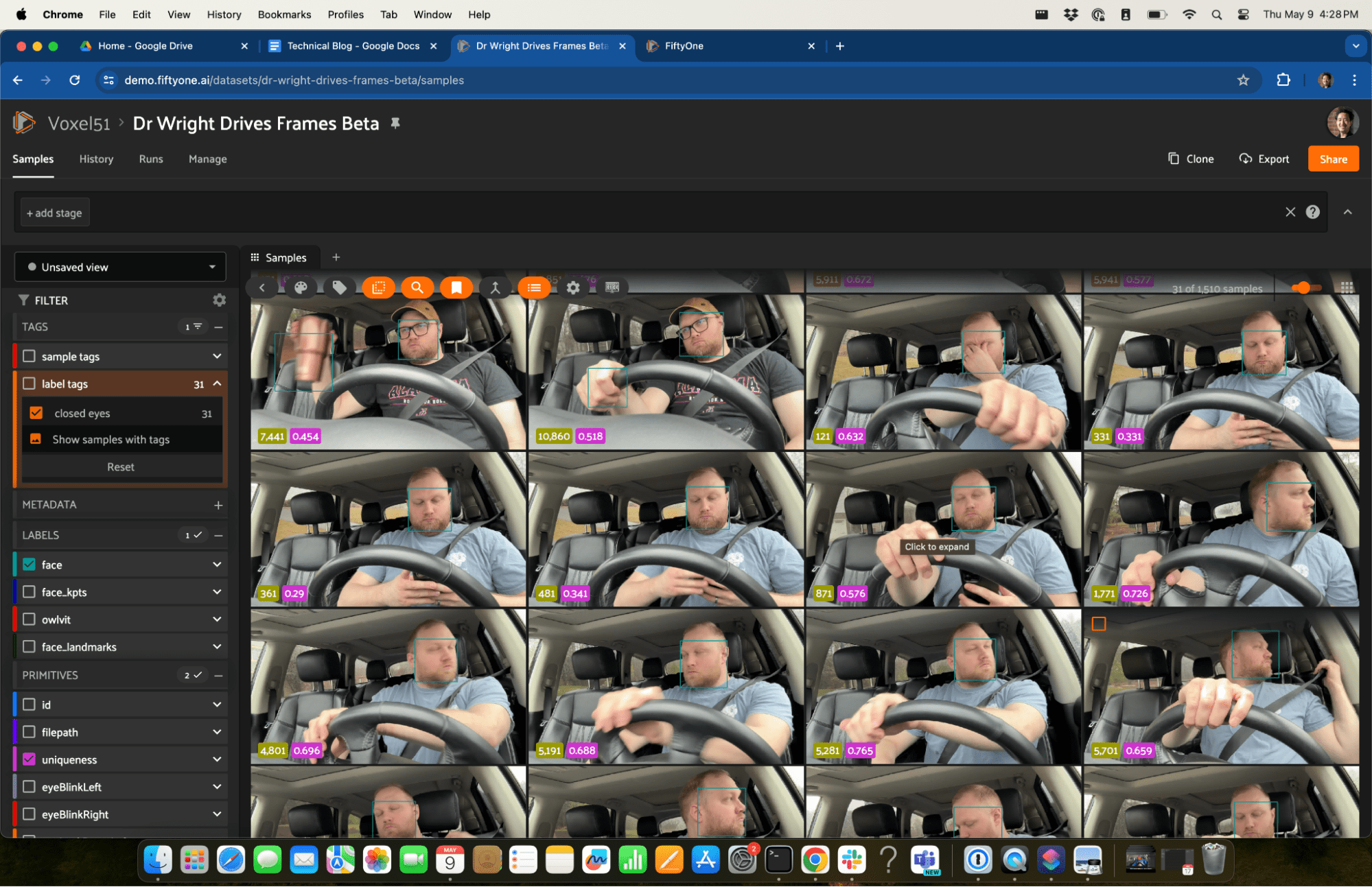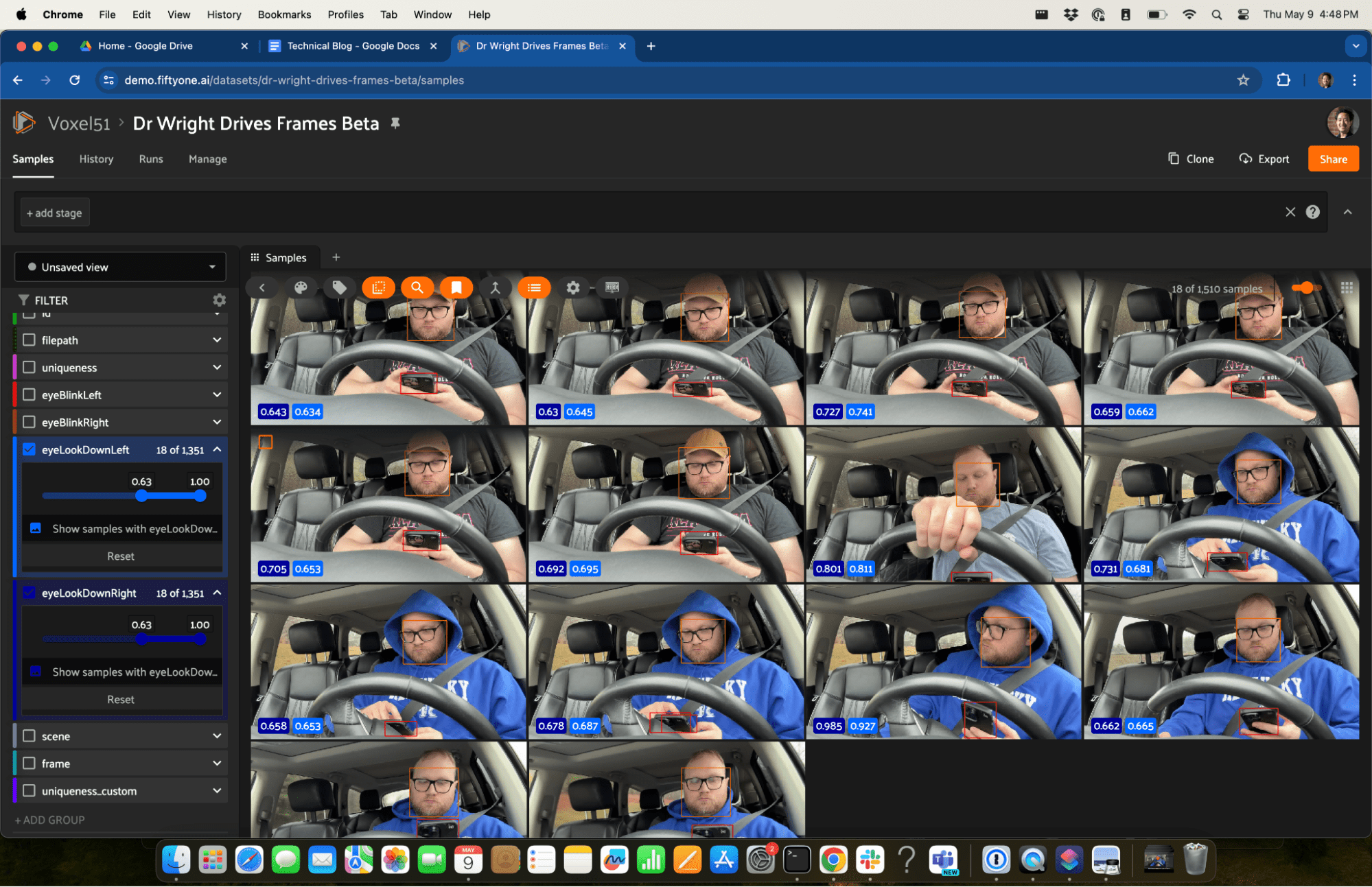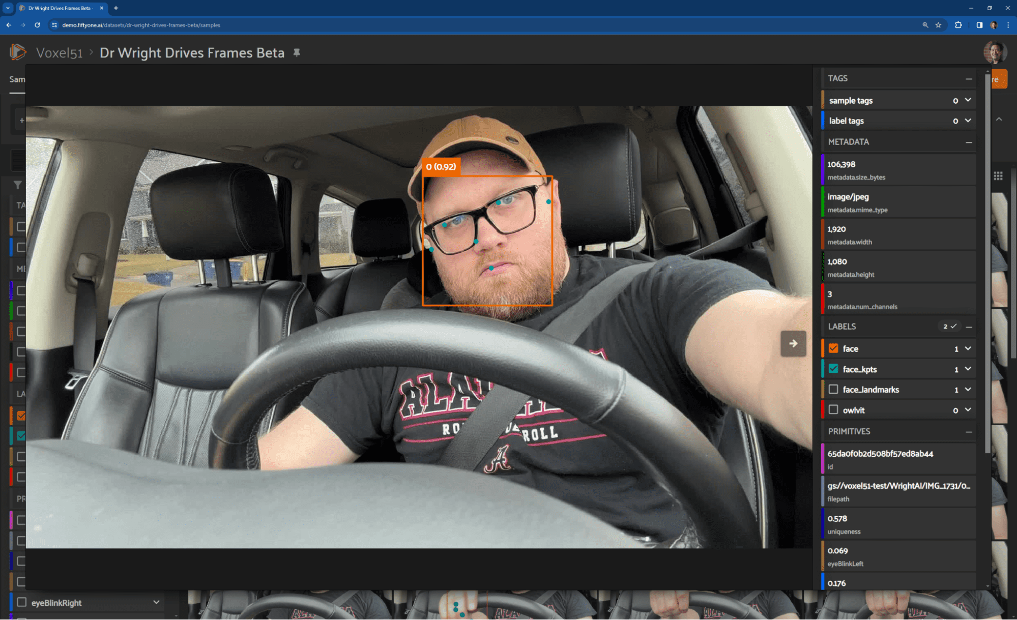 If you're interested, you can view my dataset instantly in your browser at https://try.fiftyone.ai/datasets/dr-wright-drives-frames/samples. It's the in-cabin perception dataset I discussed in this blog post made available in a read-only version of FiftyOne Teams. Try filtering the data using the left sidebar. Or click '+' next to ‘Samples’, select 'Embeddings', and choose a key. Now, lasso-select points of interest. What trends do you see?