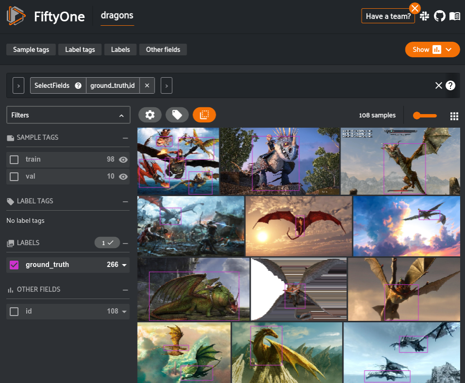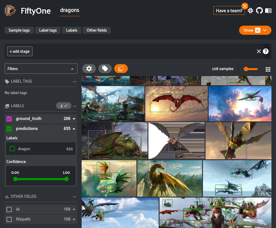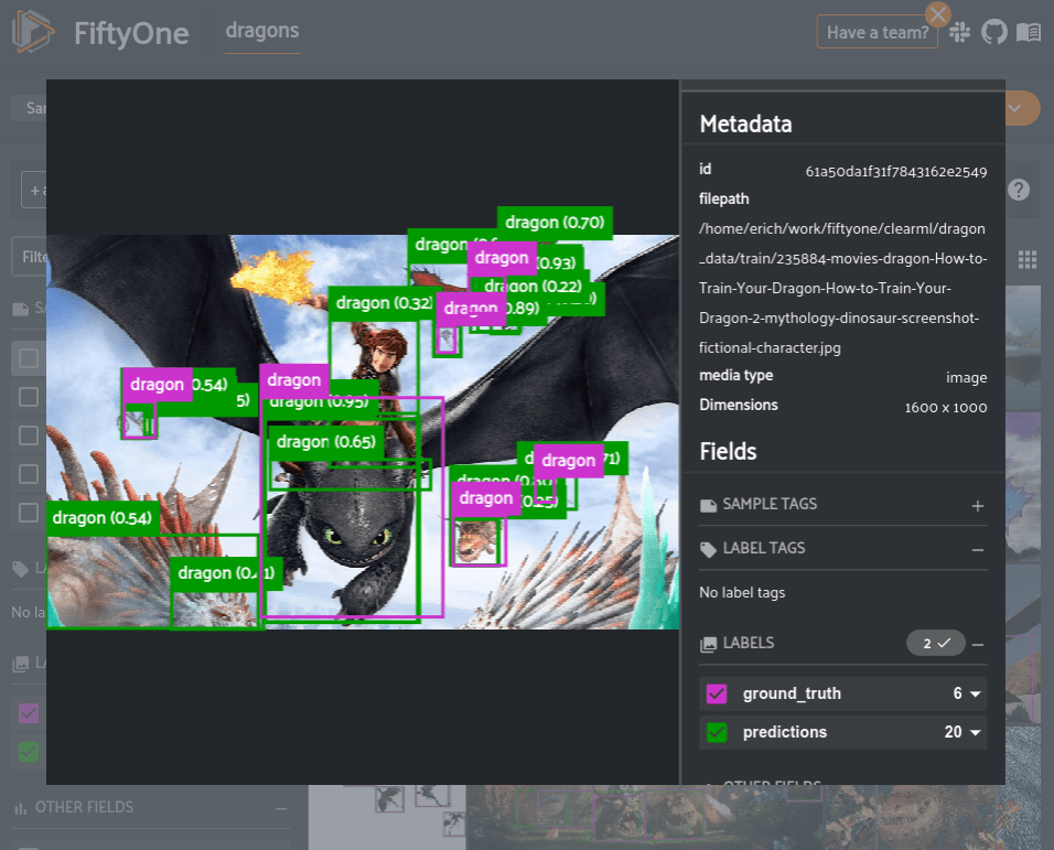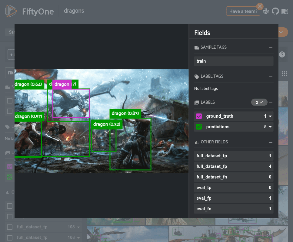 From the example above, it seems that one issue with our dataset is that we did not consistently annotate the wings of dragons. The model relatively accurately detected the dragon, but also included the wing which resulted in an IoU below the threshold used for evaluation (IoU=0.5). This detection would not necessarily be incorrect, though, so we may want to take a pass over the dataset to ensure dragon wings are consistently annotated. An easy way to reannotate this dataset is to use the integrations between FiftyOne and annotation tools like CVAT or Labelbox.