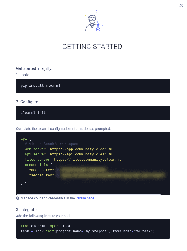 This command will set up the connection from your local PC to the ClearML server. It will ask you for your ClearML configuration. You can get this info from the Profile page in your ClearML server.