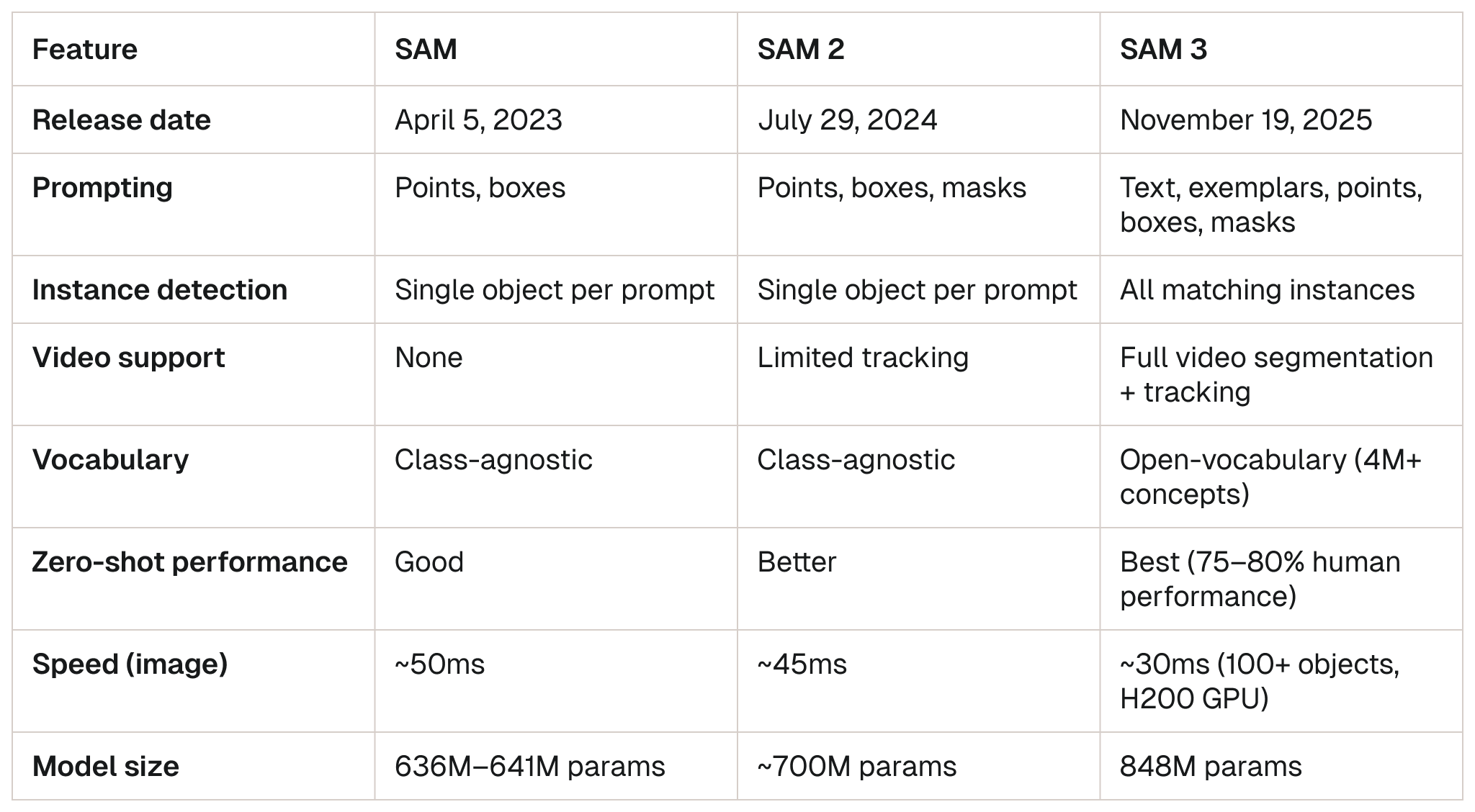 Understanding the evolution from SAM to SAM 2 to SAM 3 clarifies when to use each model: