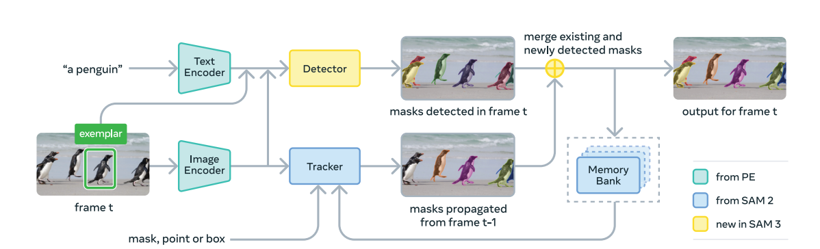 Decoupled detector tracker: Unlike SAM 2's monolithic architecture, SAM 3 separates detection and tracking components, reducing task interference and scaling more efficiently with data.