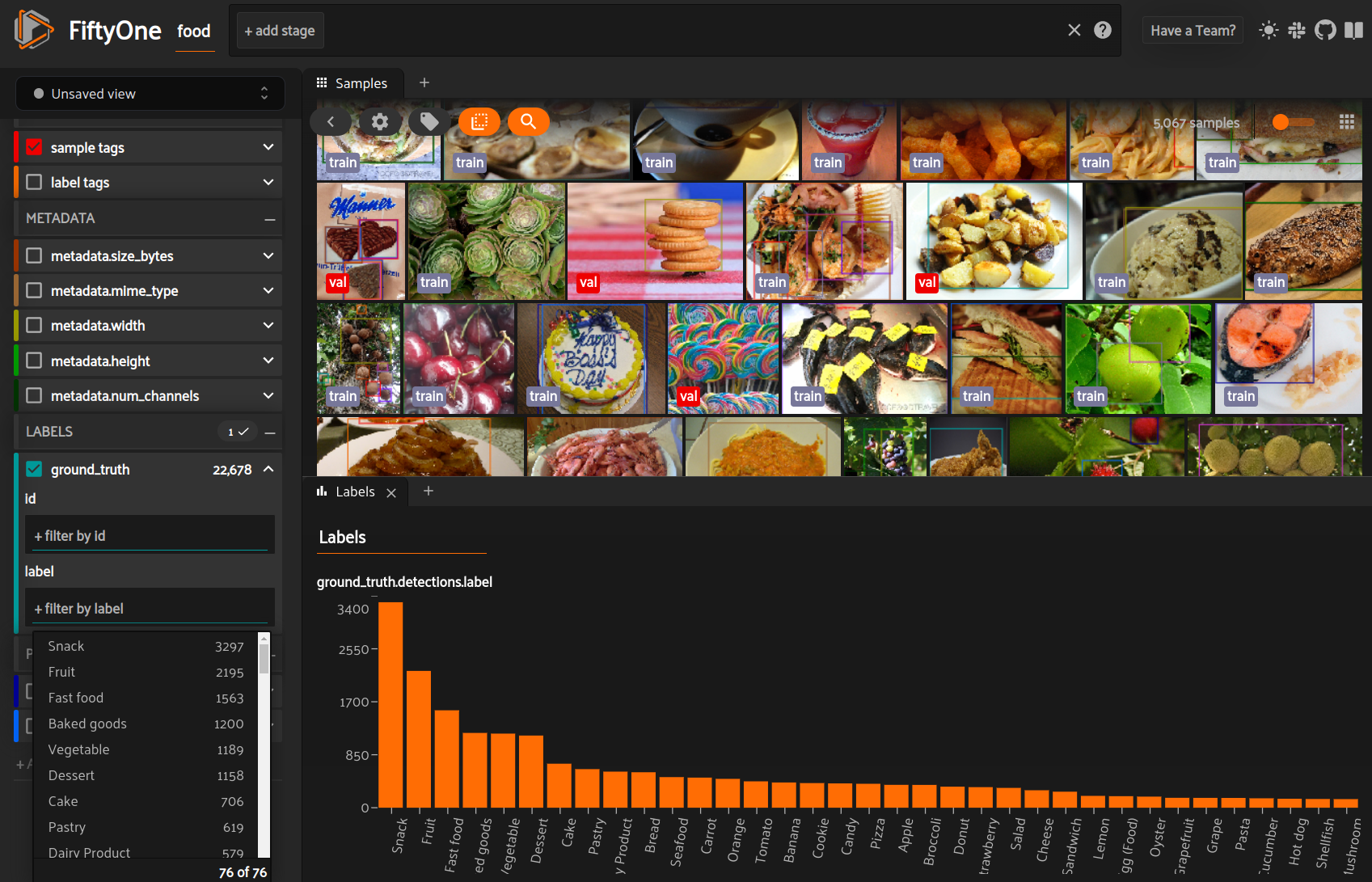 We can color by any attribute on our samples — in this case the ground truth label — and filter the contents of the sample grid interactively by selecting regions in the embeddings panel.