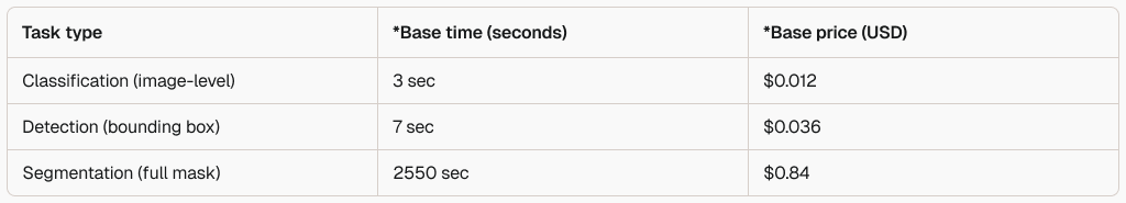For segmentation tasks, using the data above, we use a similar estimation and bucketize it for smaller and larger datasets with a threshold of 20,000 images. This is done so that costs for a smaller number of user images (< 20,000) can be accurately estimated.
