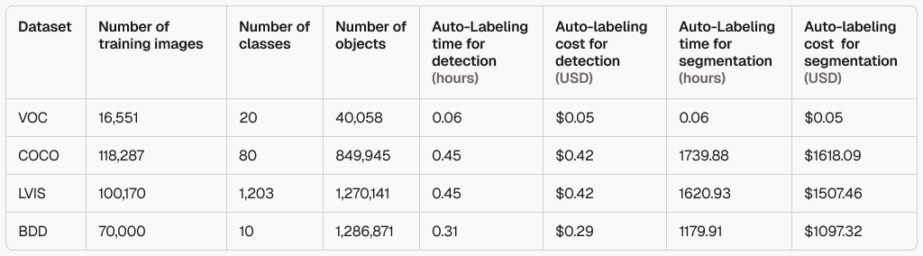 We use the benchmark data for object detection from our Verified Auto Labeling research paper. The paper covers auto-labeling benchmarks on datasets of varying classes, number of images, and complexities. We also use additional segmentation experiments conducted by the Voxel51 ML researchers to benchmark the auto-labeling time and costs.