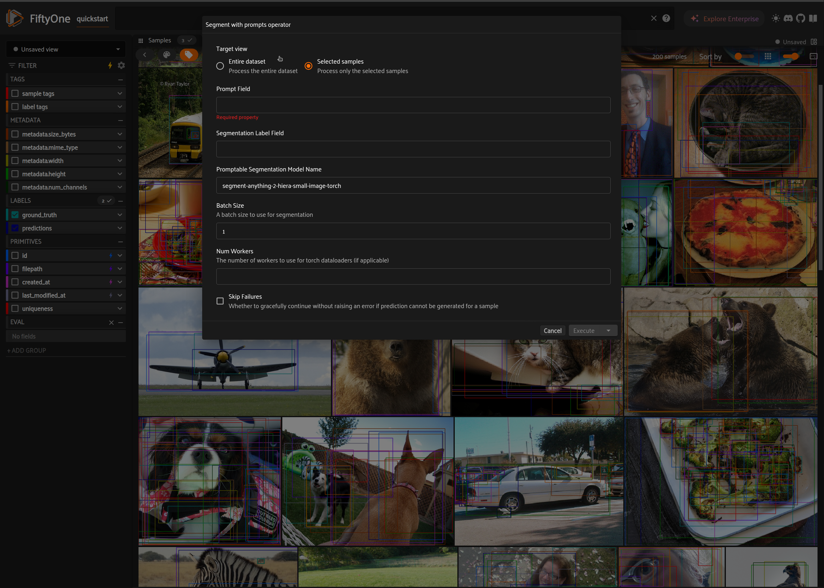 Click-to-Segment also ships with a Segment with Prompts operator, which lets you run promptable segmentation with existing visual prompts saved in a sample field. This operator supports batched inference on FiftyOne Dataset as well as Dataset View. Users have the option to save the Keypoints in the Click-to-Segment panel and run inference via this operator.