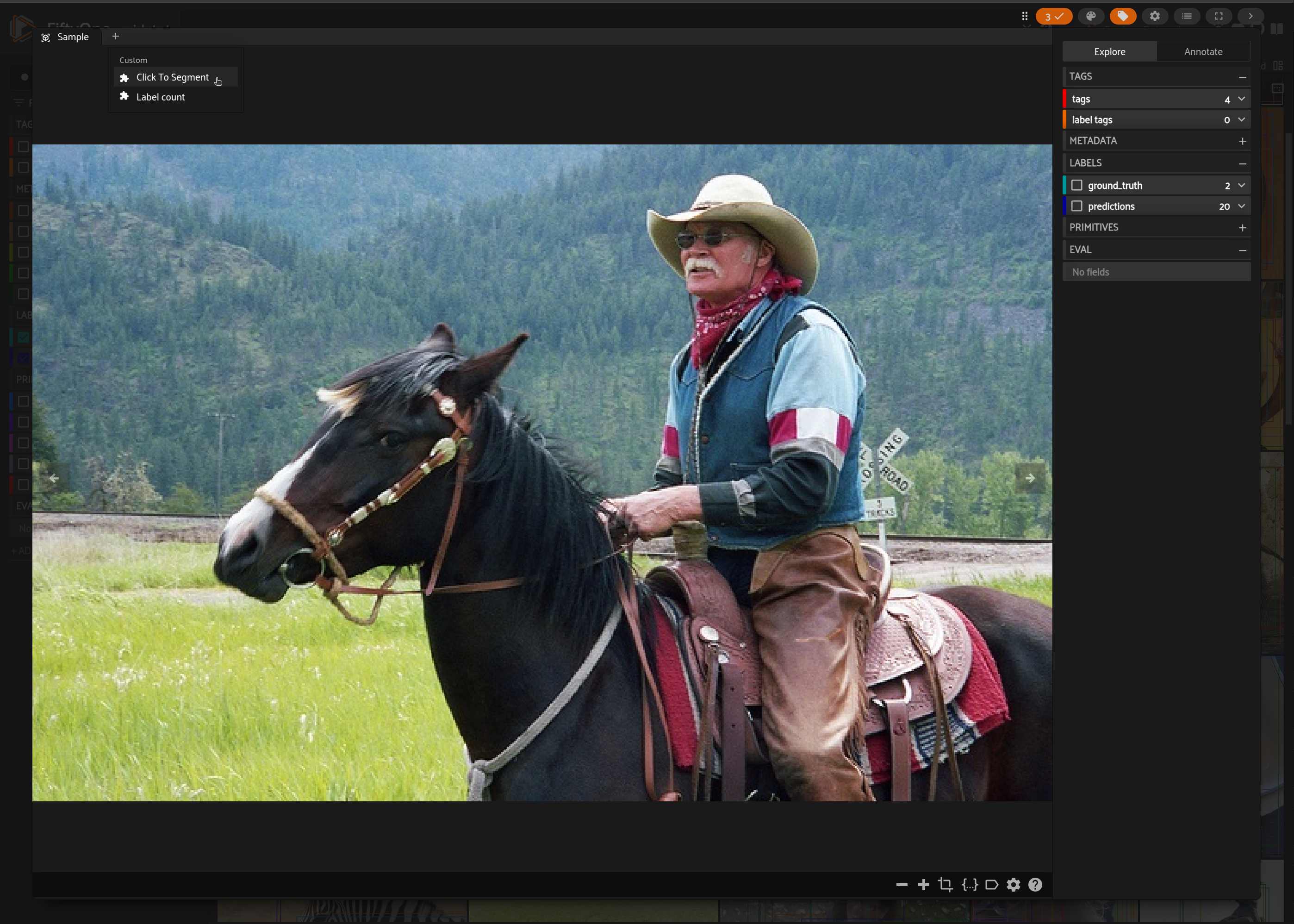 The Click-To-Segment feature in Fiftyone Labs brings interactive segmentation directly into the FiftyOne App. Click on an image, and you'll generate an instance segmentation mask using a promptable segmentation model of your choice from the FiftyOne Model Zoo.