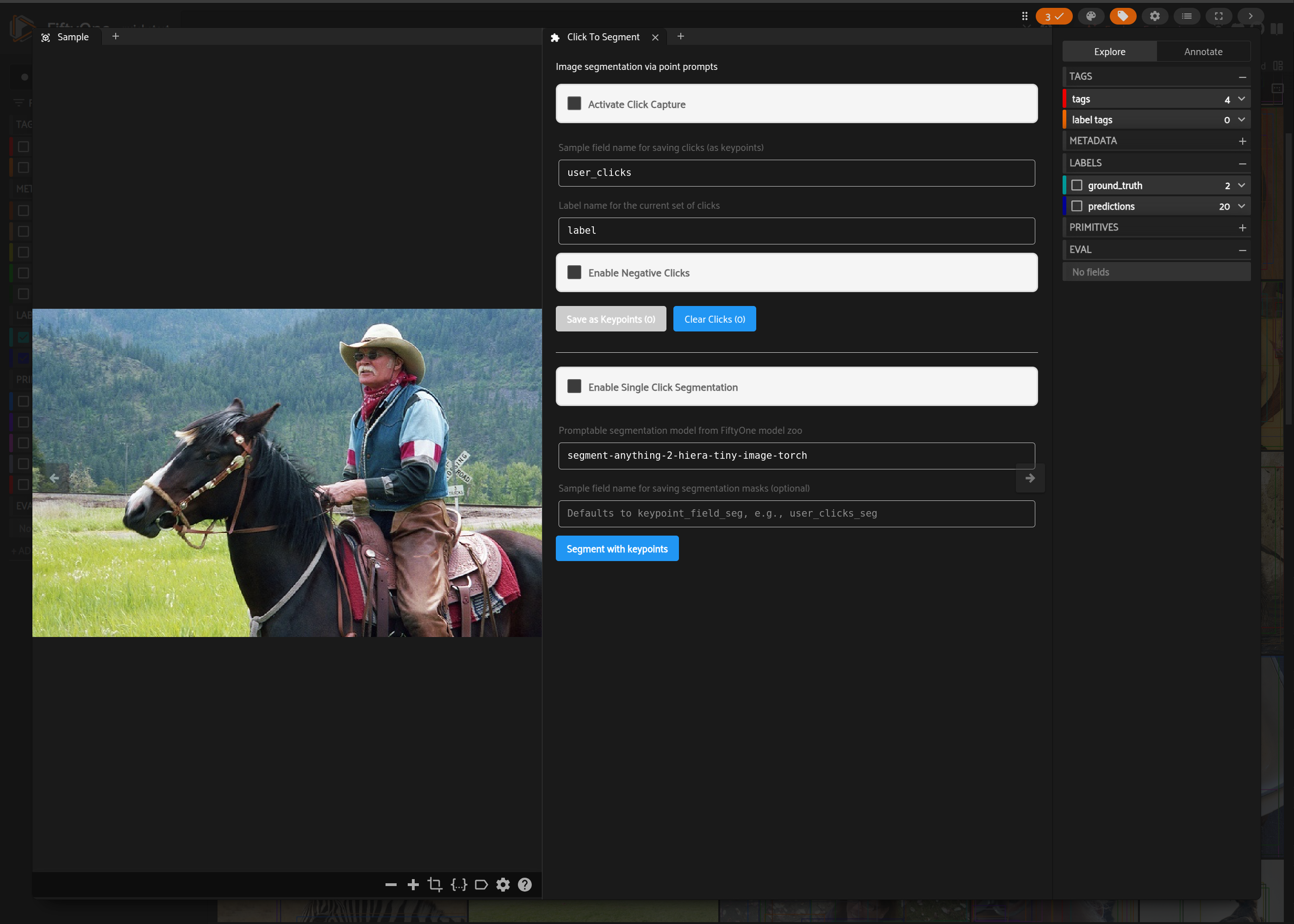 To capture image coordinates for prompting, enable Activate Click Capture. The panel captures coordinates by clicking within the Sample modal and saves each set of clicks as an instance-level Keypoint in a named sample field (e.g., user_clicks) of type Keypoints. Each Keypoint can contain both positive and negative point prompts, giving you fine-grained control over your masks.