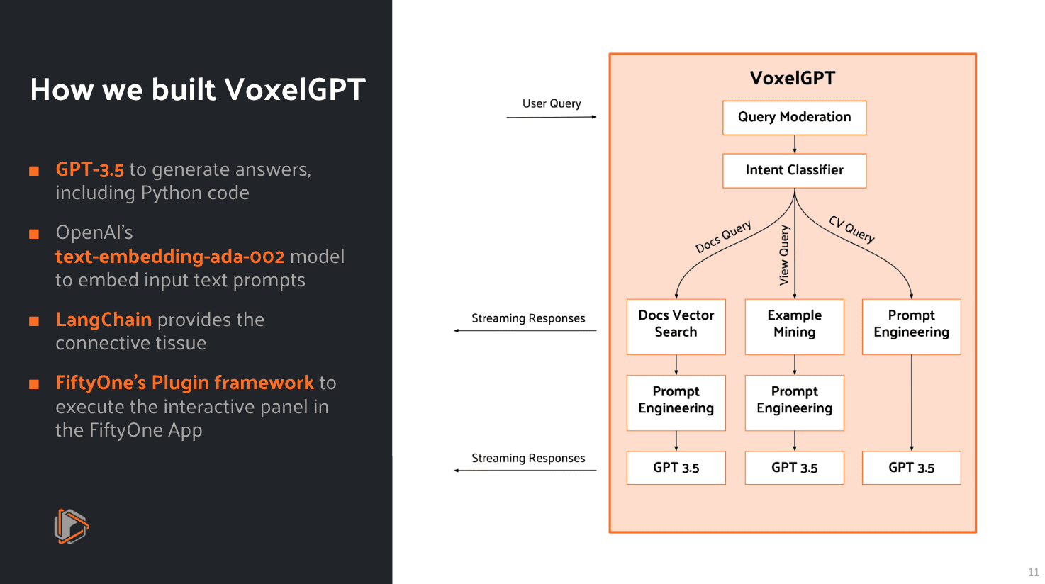 And he walks through the code used to build VoxelGPT at ~25:12 in the playback video, explaining which pieces of code perform which tasks to bring VoxelGPT to life as a plugin. You can see VoxelGPT instantly in your browser at gpt.fiftyone.ai! And because VoxelGPT is 100% open source, you can find everything you need to use it locally on GitHub.