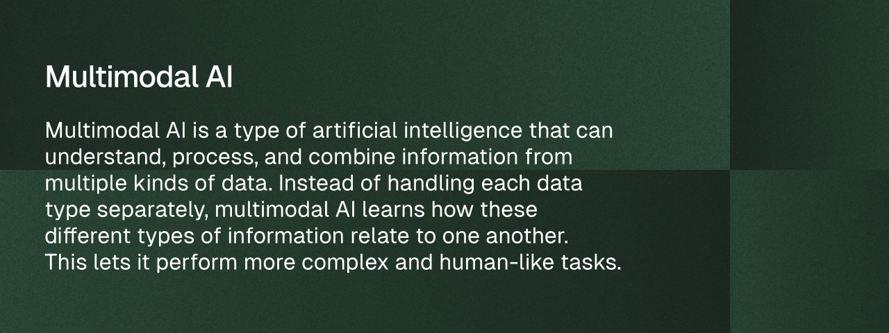 Multimodal AI delivers capabilities that are difficult or impossible to achieve with single-modality systems. This allows enterprises to deploy more advanced AI capabilities without separate, siloed systems. Other benefits include: