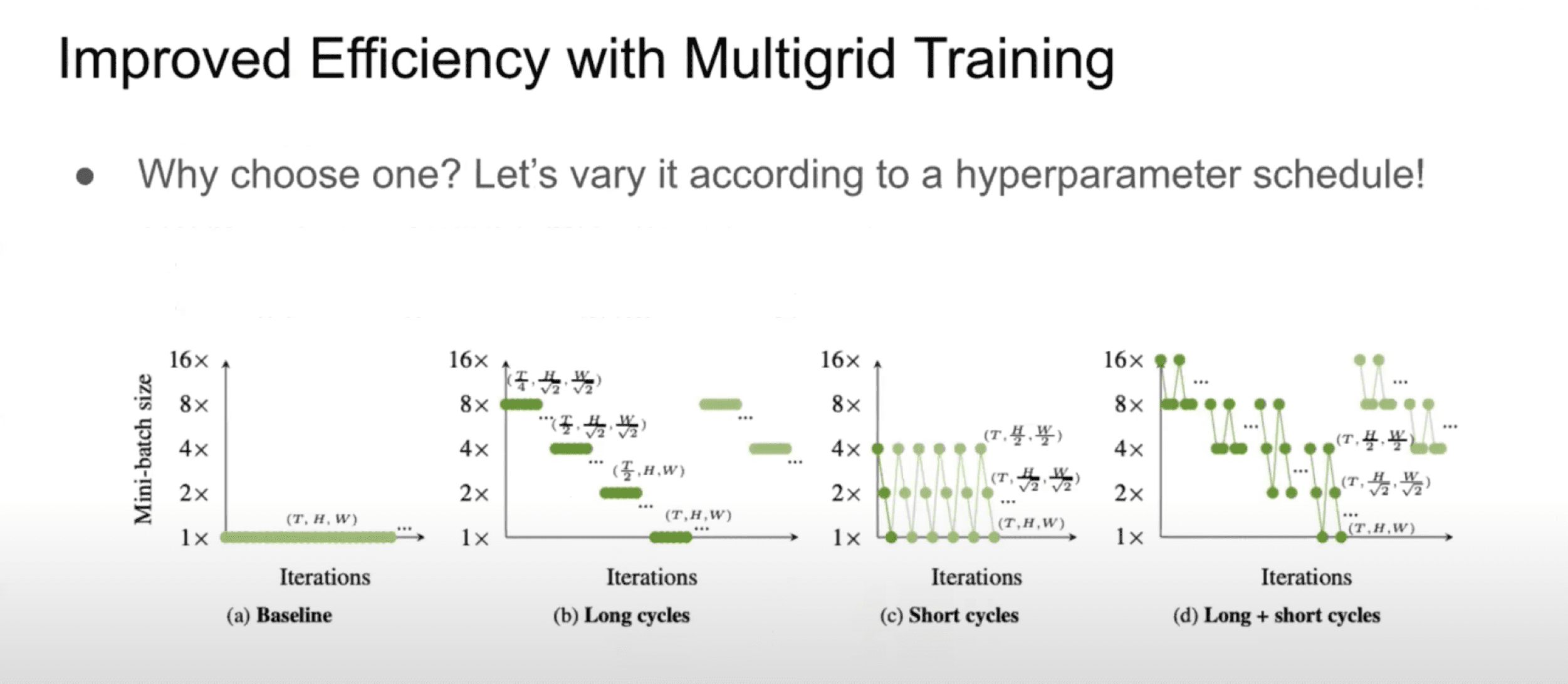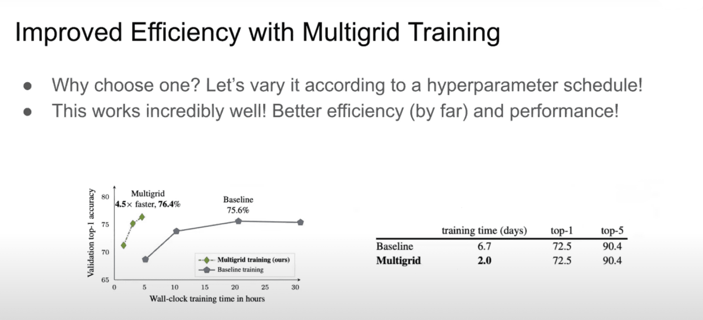 In the image below on the right, you can see the results for training over a Kinetics dataset on a single GPU using this multigrid training method. This leads to improved efficiency – the same performance in just two days instead of nearly an entire week!