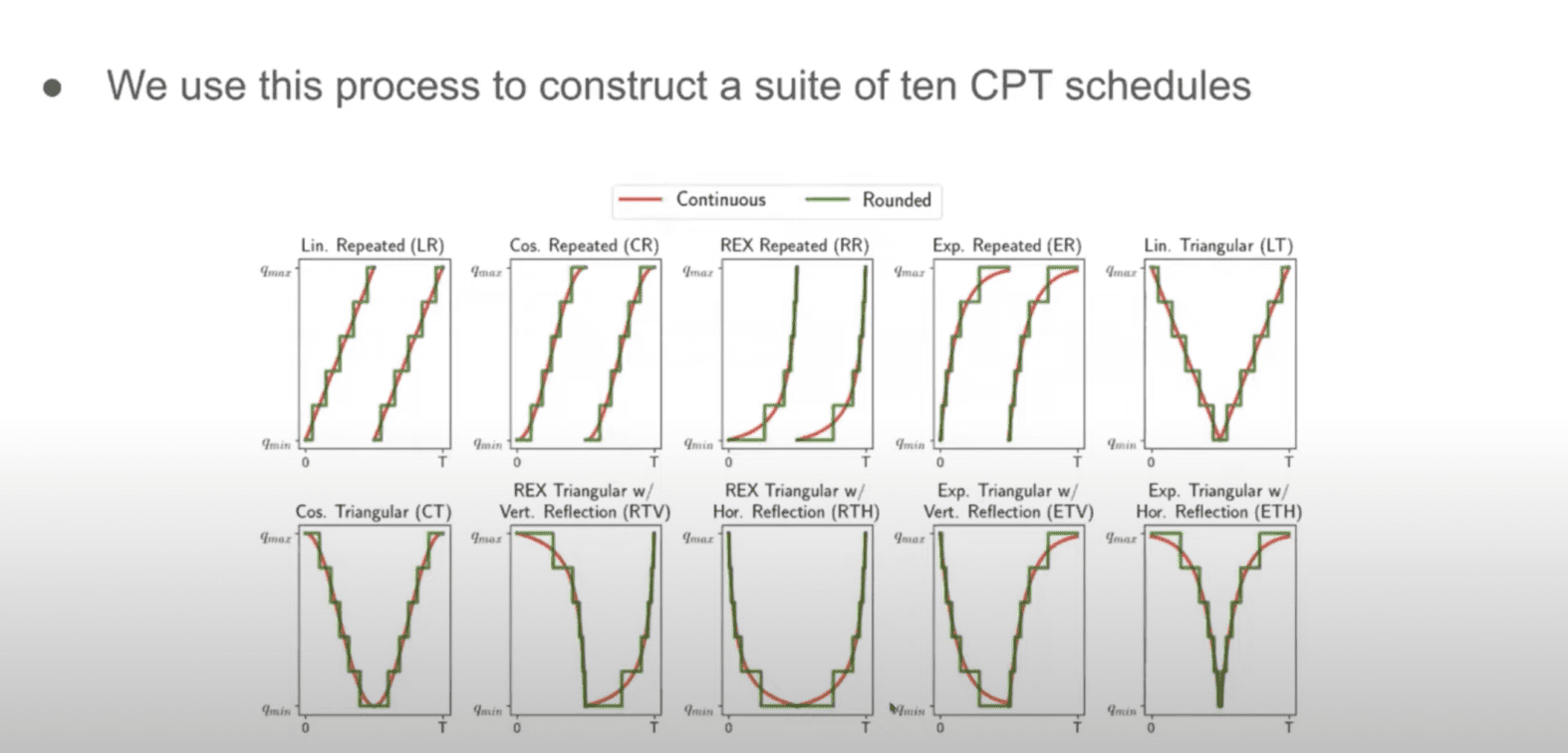 Cameron’s research collapses the 10 schedules into three groups (large schedules, medium schedules, and small schedules) based on the impact they have on the amount of compute savings you get. Here’s the mapping -> large = RR and RTH; medium = LR, LT, CR, CT, RTV, ETV; small = ER, ETH. (You may want to come back to these mappings later when you review the precision takeaways later in the post.)