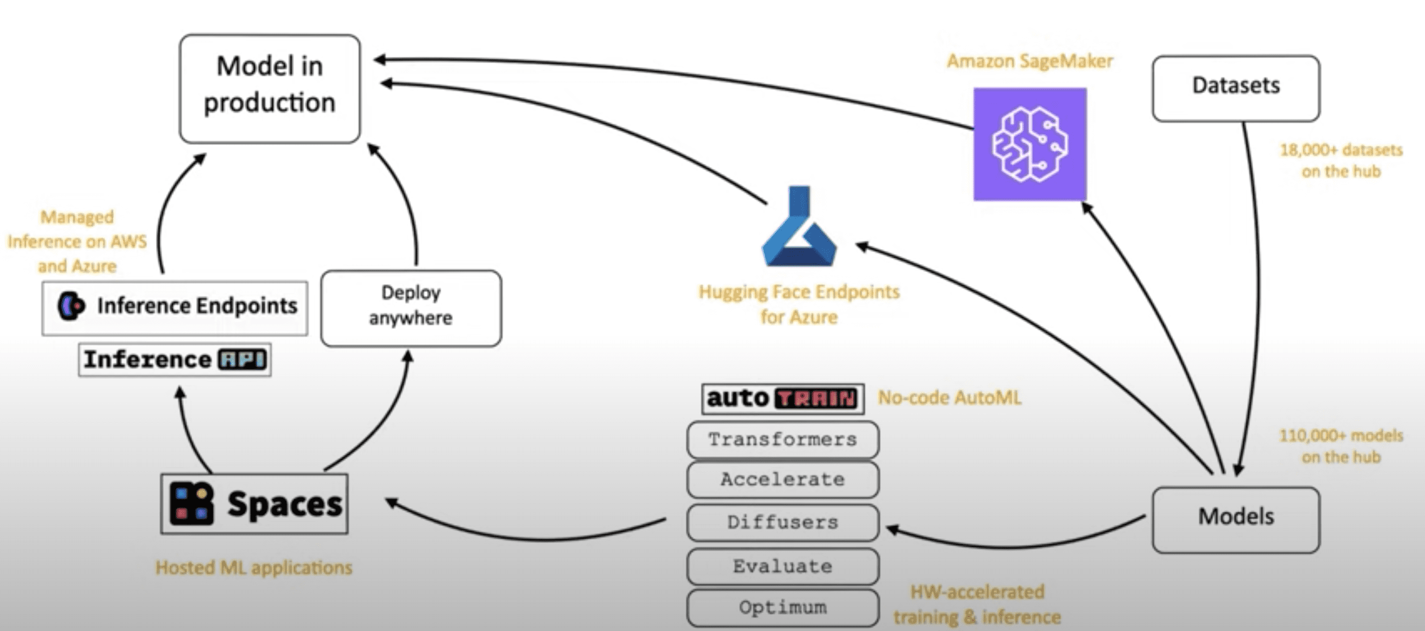 Julien then heads over to the Hugging Face Hub to show us how easy it is to download, train, and deploy models. He also shows the inference widget where you can predict images in the Hub, as well as links to datasets that the model has been trained on and Spaces, where you can quickly build, host, and share your ML apps. Live demo time! Starting at ~16:49 in the presentation, Julien shows an app he built in Spaces that predicts an image (prediction happens with just two lines of Python code!) with 10+ models and displays the results. But what about more advanced models? Julien picks three – image captioning, zero shot segmentation using a text prompt, and audio classification using spectrogram – and shows several interactive live demos on Spaces. Then he covers multi-modal transformers, and diffusers, all with live demos and code snippets. Experimenting with models has never been easier! In addition to working with inferences and models, you can also train and deploy with Hugging Face. Julien walks us through the “family picture” that includes all the goodies available from Hugging Face today.