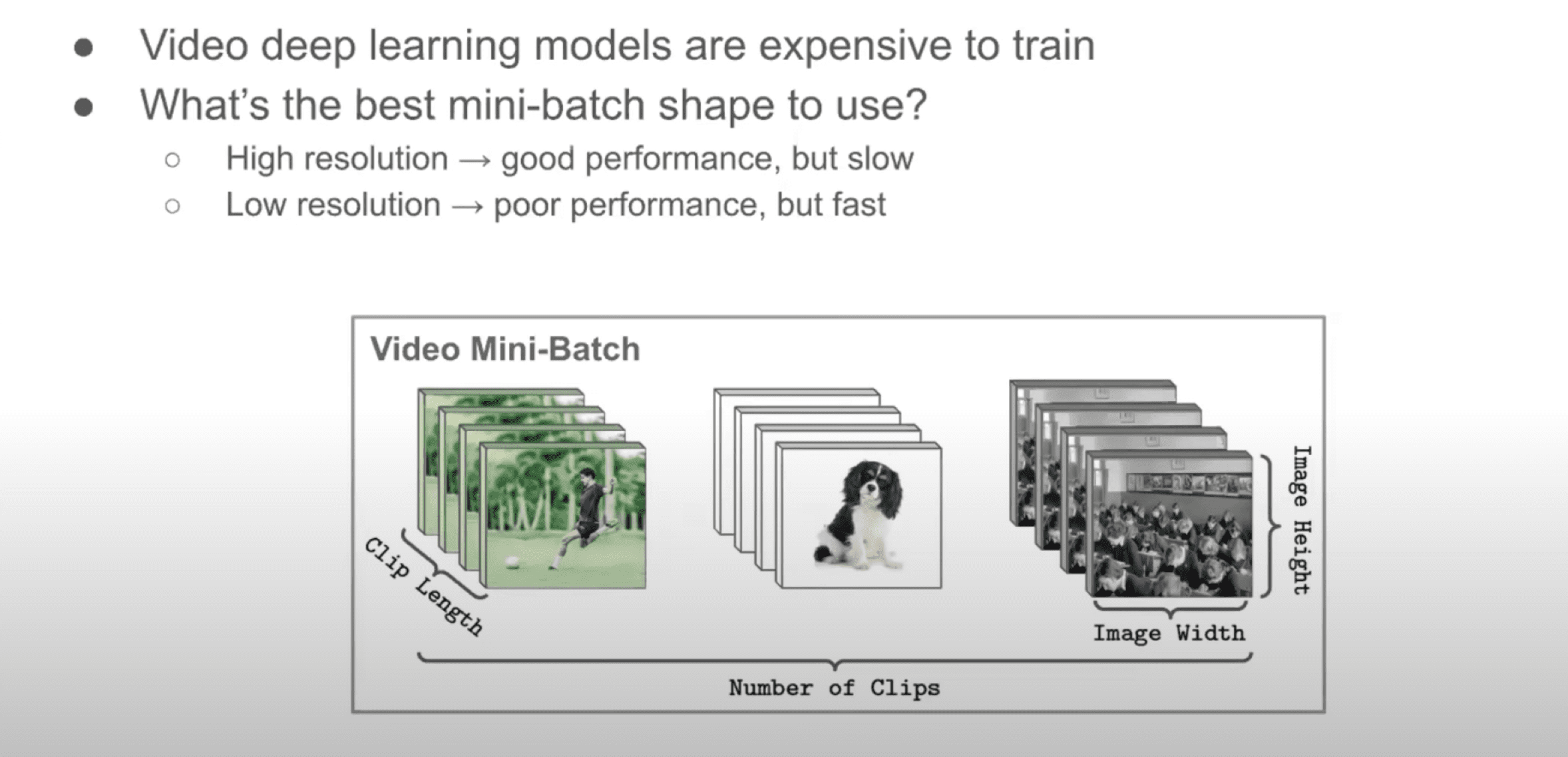 The last part of Cameron’s presentation is about video deep learning and how cyclical batch sizes can speed up wall-clock training time. In this section, Cameron walks us through some background found in the SlowFast Networks for Video Recognition paper. The idea is that instead of having just a single 3D CNN that we convolve over the entire input video over multiple layers, we separate our network into two different modules: the Slow Pathway, which is in charge of capturing spatial or semantic features; and the Fast Pathway that's in charge of capturing motion features.