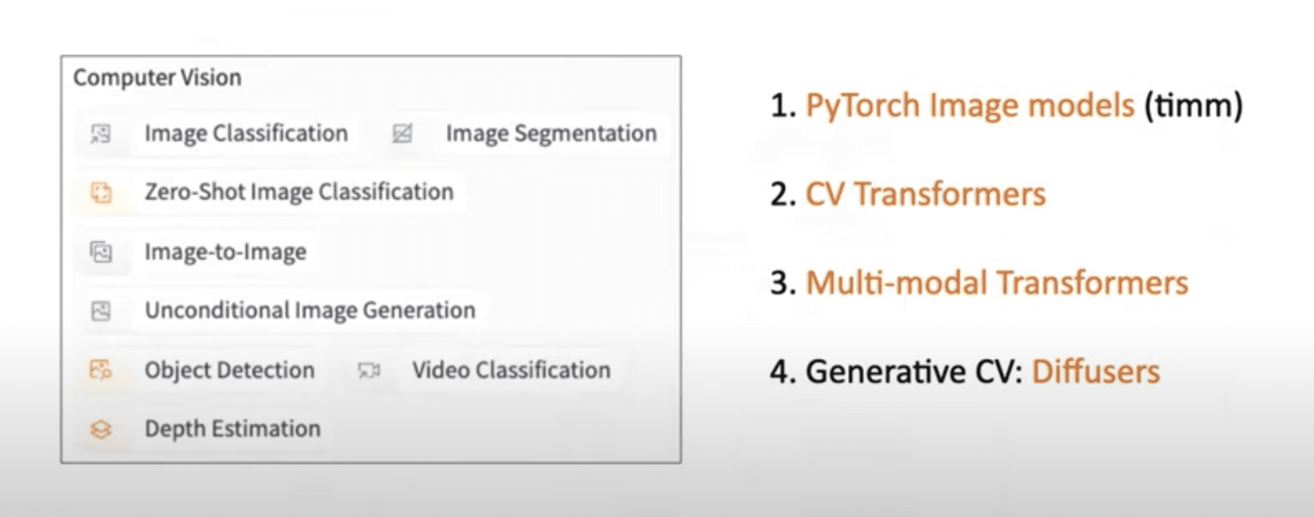 Zooming in on computer vision, Julien notes that Hugging Face hosts about 4,000 computer vision models covering a variety of tasks across four broad categories.