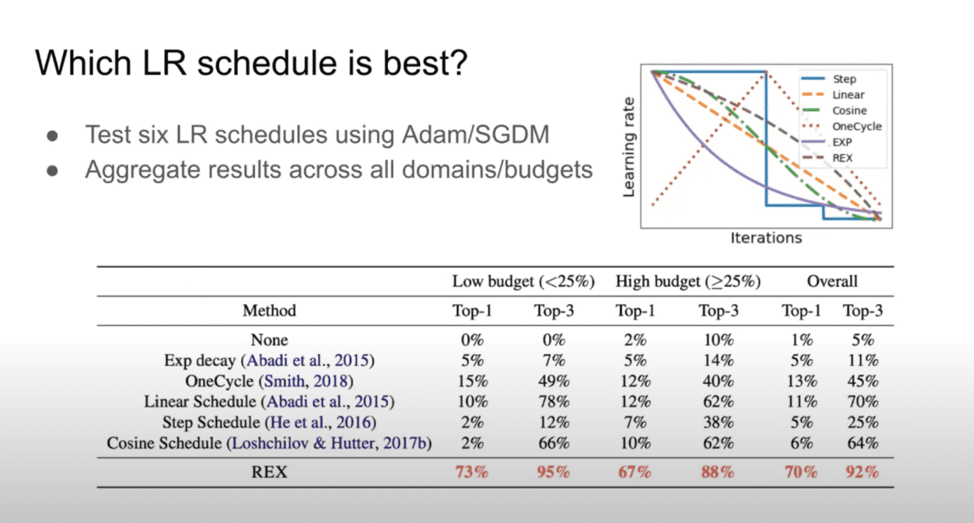 What Cameron’s research contributes is a new profile for learning rate decay: reverse exponential or REX, which is a learning rate schedule that keeps the learning rate high for a while and then decays it to a lower learning rate at the end of training.